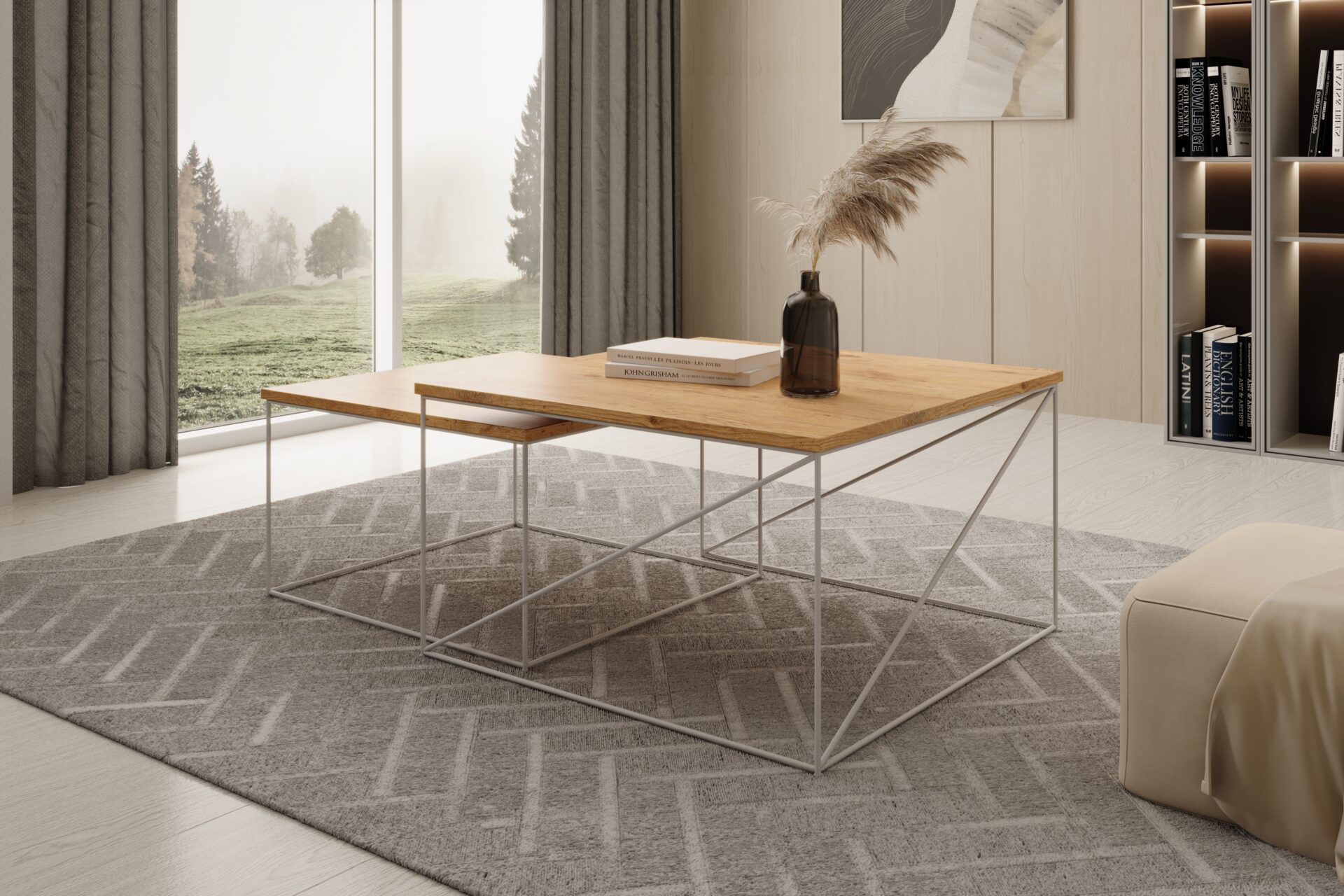 The Licco 2-in-1 coffee table is a stylish and functional piece that will undoubtedly add elegance to any interior. Its modern, minimalist design blends seamlessly with a variety of interior styles, while high-quality materials ensure durability and solidity. The square top offers ample space for coffee, books, decorations, and other items, while the wire legs give the table a light and modern feel. The wire legs are durable and stable, while also adding a subtle industrial touch. The table can be easily transformed or used in various configurations, making it highly practical. It can also be split into two separate tables, providing even more arrangement options.
