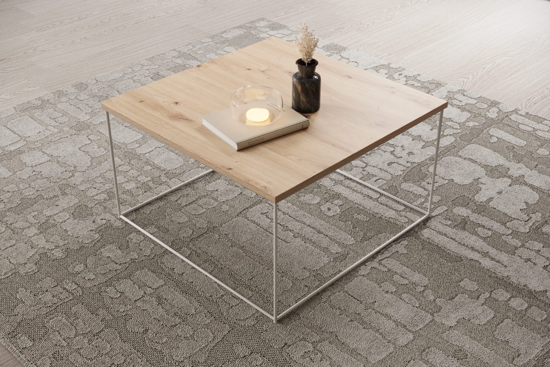 The Roni coffee table is an elegant and modern piece of furniture that will fit perfectly into any contemporary interior. It features a square top made of durable laminated board, which is scratch-resistant and easy to keep clean. The laminate is available in various finishes, such as imitation wood, concrete, or solid color, allowing the table to complement a variety of interior design styles. The table’s base is a unique steel wire leg, which adds a lightness and industrial character. The wire is precisely formed into a geometric pattern, creating an interesting yet stable structure. The metal leg can be finished in matte black, white, or another color, further enhancing the table’s modern design. The Roni coffee table is not only functional but also aesthetically pleasing, perfect for living rooms, perfect for Scandinavian, loft, or minimalist spaces. Thanks to its universal design, the Roni will become the focal point of any interior.