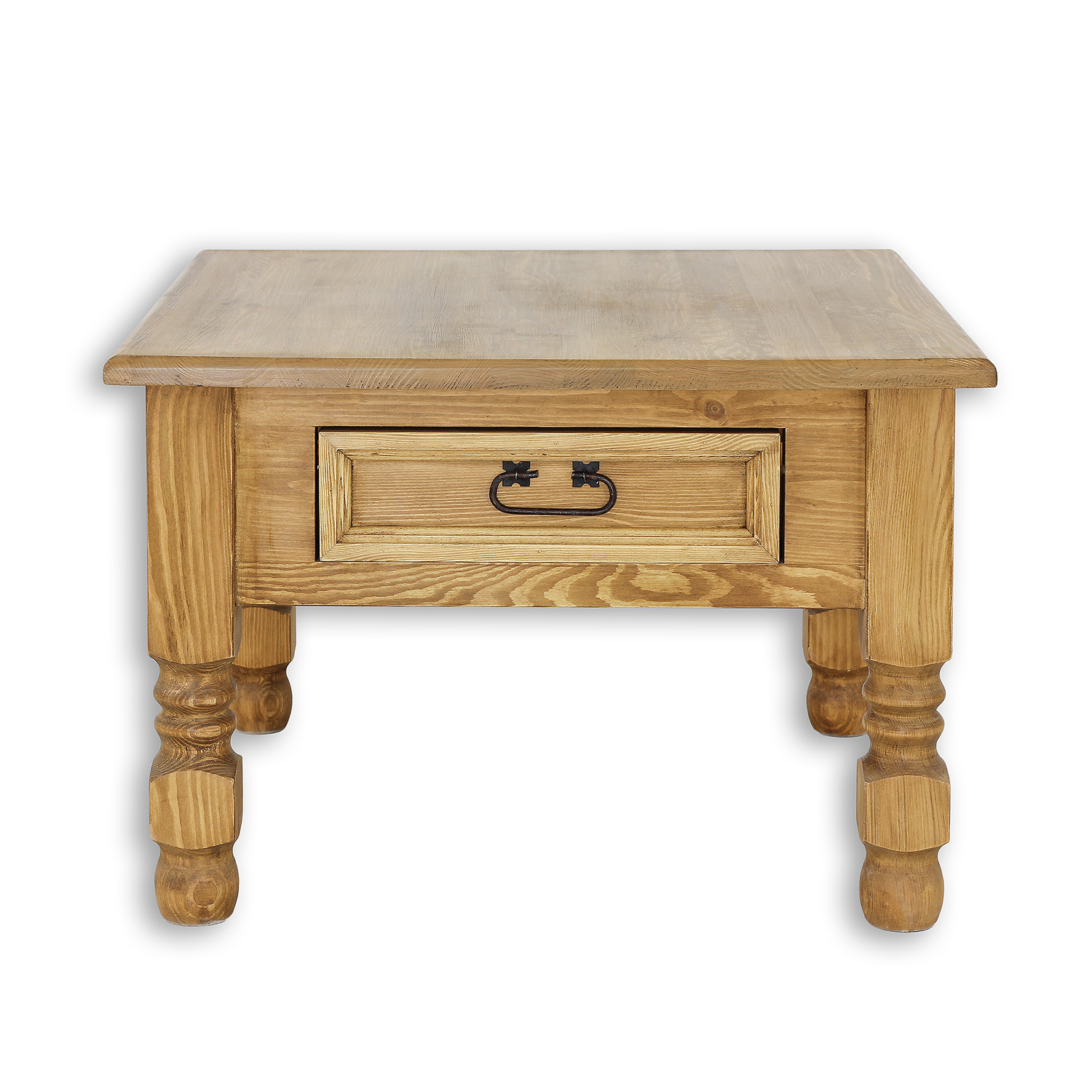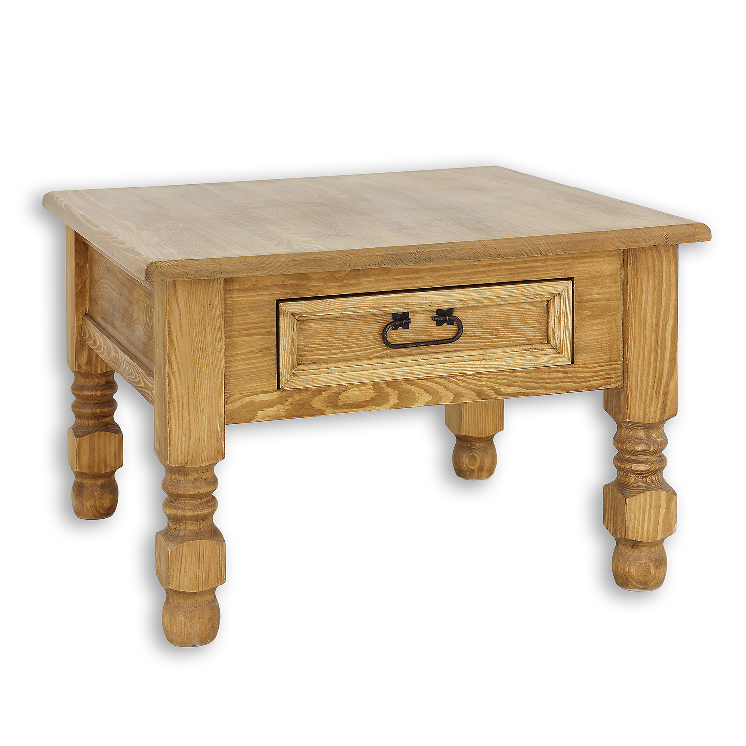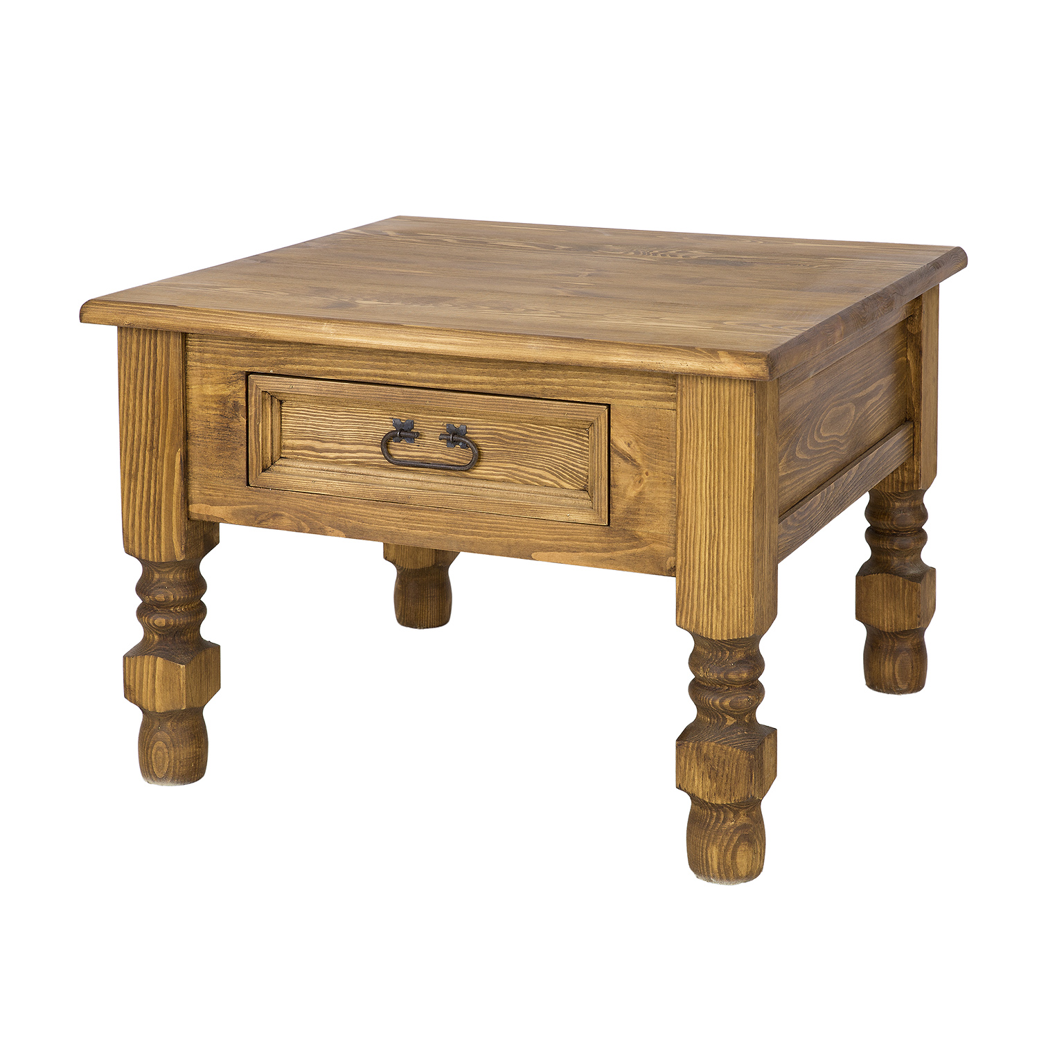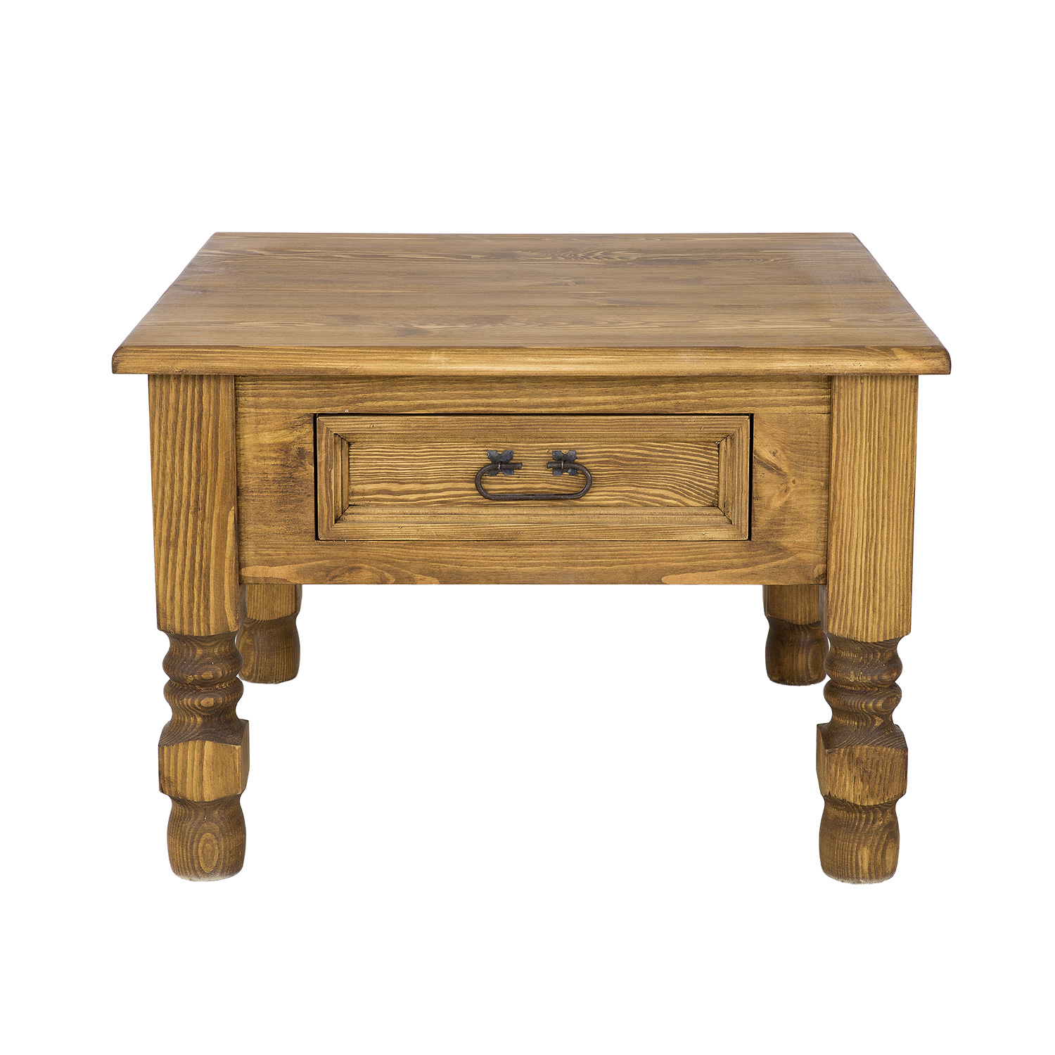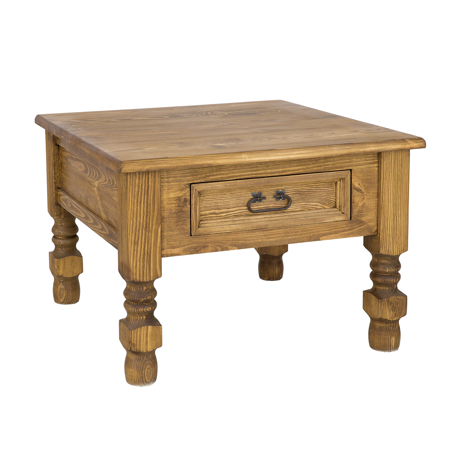 The ST705 waxed coffee table. Designed in a rustic style, it’s crafted entirely from solid pine. This essential piece for any stylishly furnished interior is characterized by its ergonomic shape and sturdy construction. The tabletop provides ample space to comfortably place plates with snacks or cups of hot tea. The table features thick, expressive 8cm x 8cm legs and a carved drawer that slides out on wooden runners. Handmade metal hinges and handles with an aged finish were used in its construction. The ST705 coffee table will add a unique atmosphere to any interior, full of warmth and a homely atmosphere.