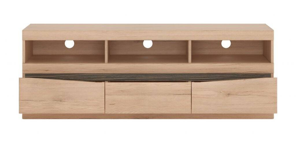 Add a touch of freshness and functionality to your interior with the Summer TYPE 51 TV stand, the quintessence of modern design. The perfect color combination of San Remo Light and Arusha gives this piece not only a timeless character but also introduces a warm and natural atmosphere to the room. Reflecting a contemporary lifestyle, its 150 cm width perfectly fits the requirements of a large media space while maintaining an elegant and subtle look. A key advantage of this TV stand is its functional height (53.5 cm) and depth (39.9 cm), ensuring optimal comfort and ample space for your multimedia devices. The robust construction is evident in the use of durable materials – laminated board and MDF guarantee durability and resistance to everyday external factors such as damage, scratches, and moisture. The natural color, which blends perfectly with many color palettes, enhances the aesthetic appeal and makes the piece incredibly easy to match to a variety of interiors. The Summer TYP 51 TV cabinet proudly showcases its three spacious drawers equipped with branded accessories and a soft-close system. These drawers provide excellent storage for all your gadgets, games, and accessories, ensuring the space around your TV is always organized and free from unsightly clutter. Intuitive open shelves create space for your set-top box, game console, or DVD player, allowing easy access to devices and efficient cable management.