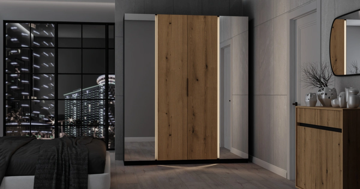 Front – 16 mm laminated board – Evoke Oak + mirrors – 3 mm