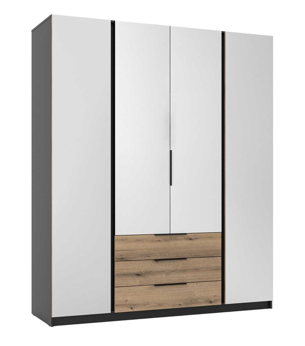 The four-door wardrobe is made of laminated board and features four mirrors, shelves, a hanging rail, and three drawers. Parameters: