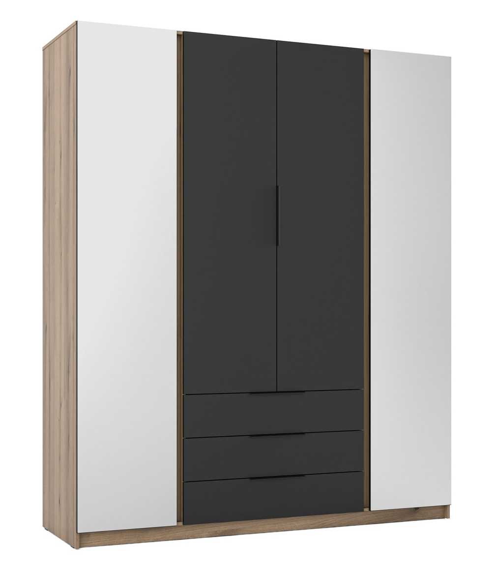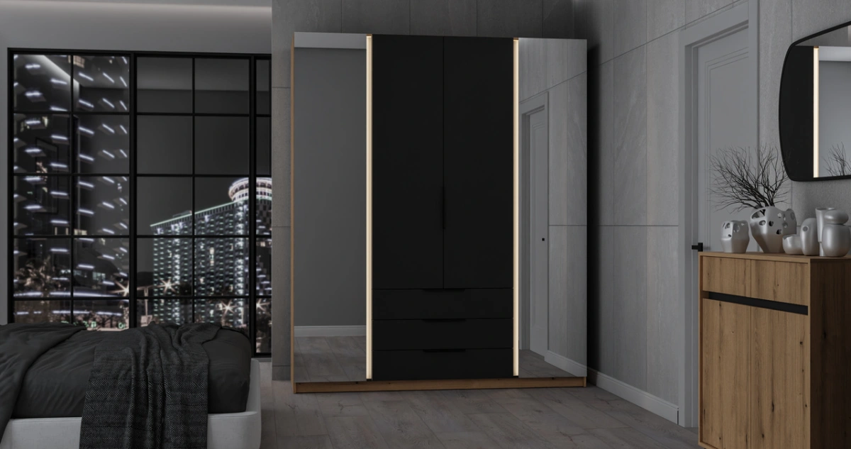 The four-door wardrobe is made of laminated board and features two mirrors, shelves, a hanging rail, and three drawers. Parameters: