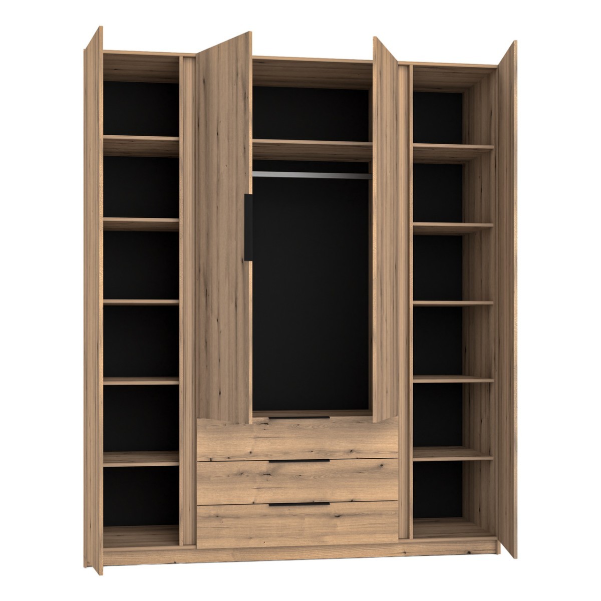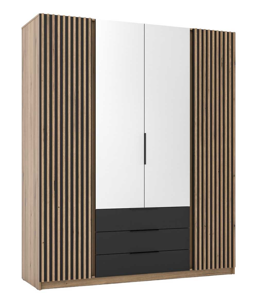 The four-door wardrobe is made of laminated board and features decorative slats, two mirrors, shelves, a hanging rail, and three drawers. Parameters: