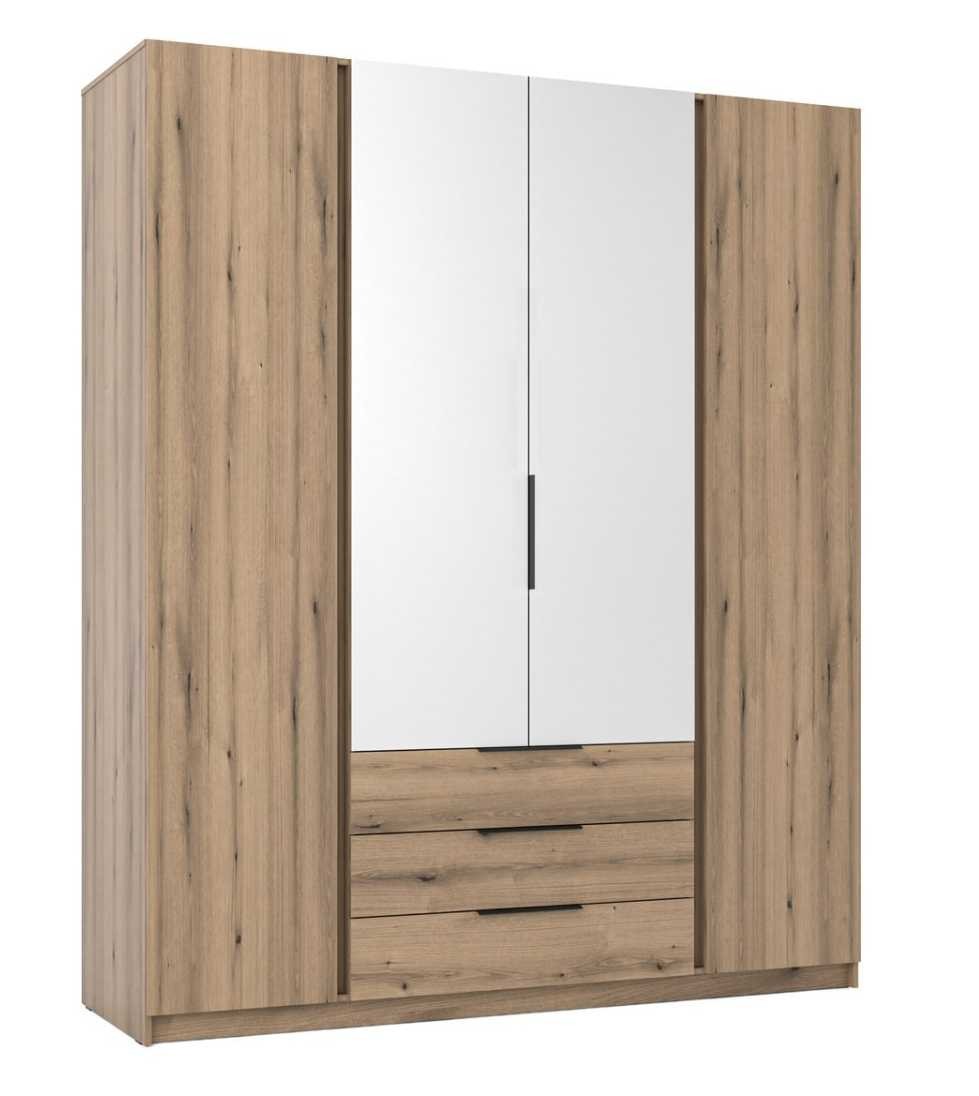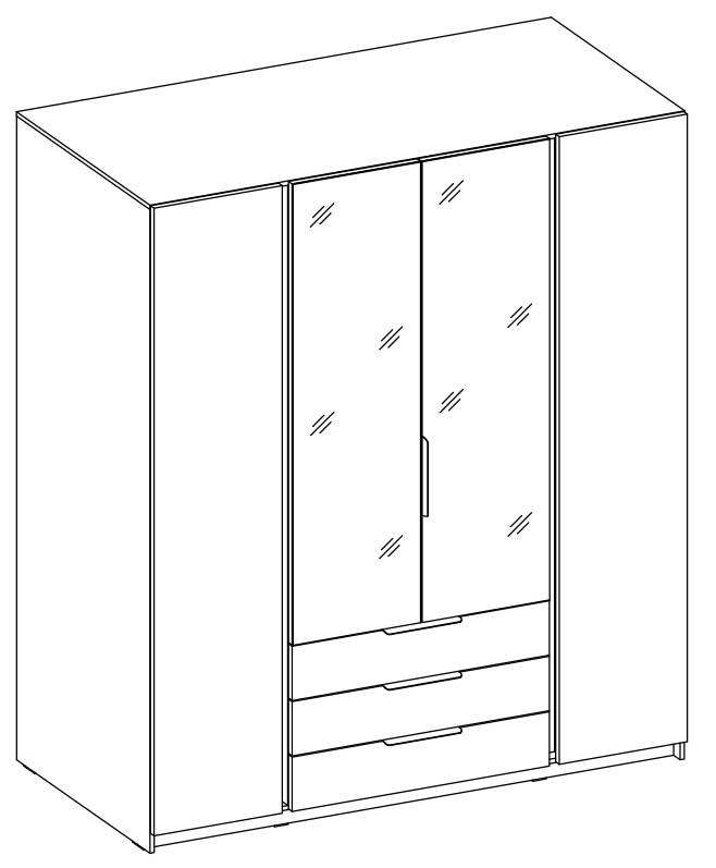 The four-door wardrobe is made of laminated board and features two mirrors, shelves, a hanging rail, and three drawers. Parameters:
