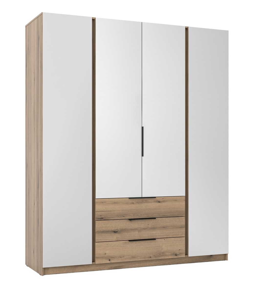The four-door wardrobe is made of laminated board and features four mirrors, shelves, a hanging rail, and three drawers. Parameters: