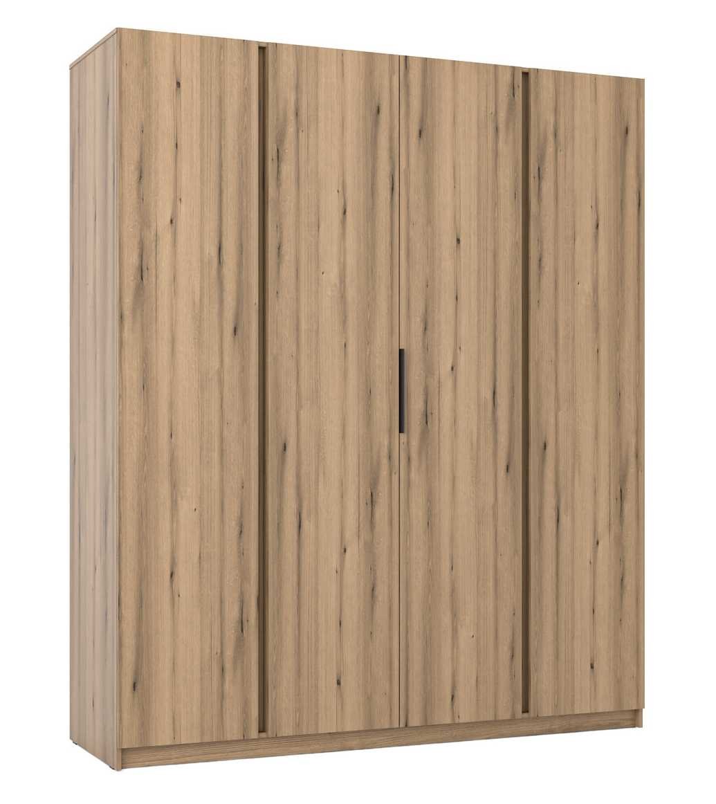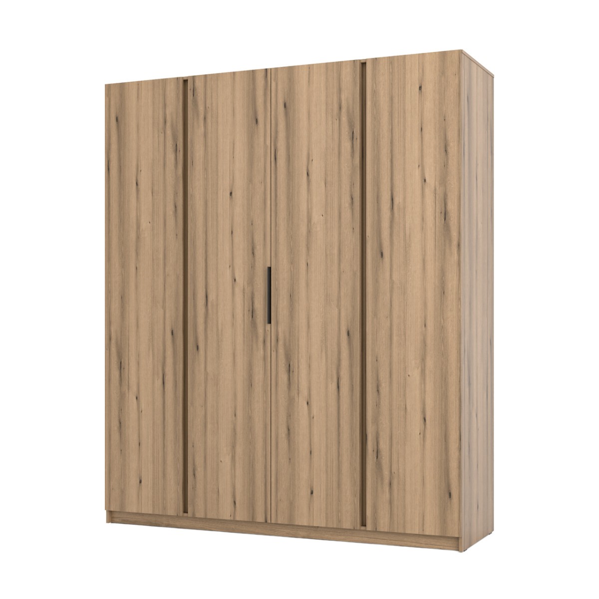 The four-door wardrobe is made of laminated board and includes shelves and a hanging rail.