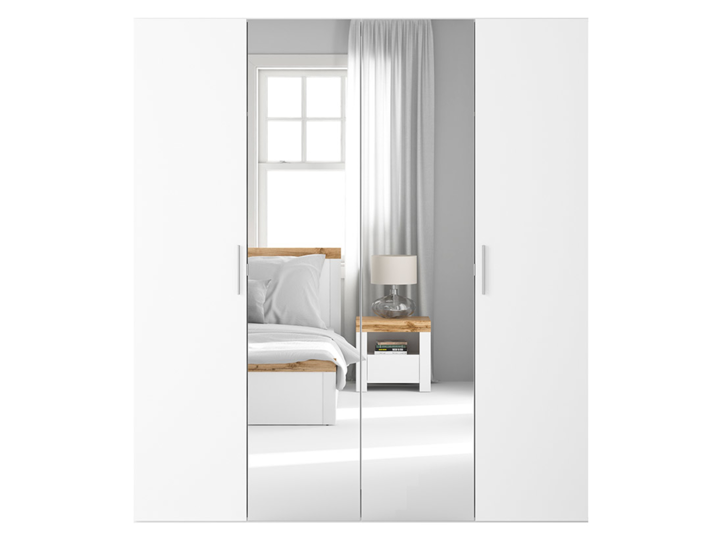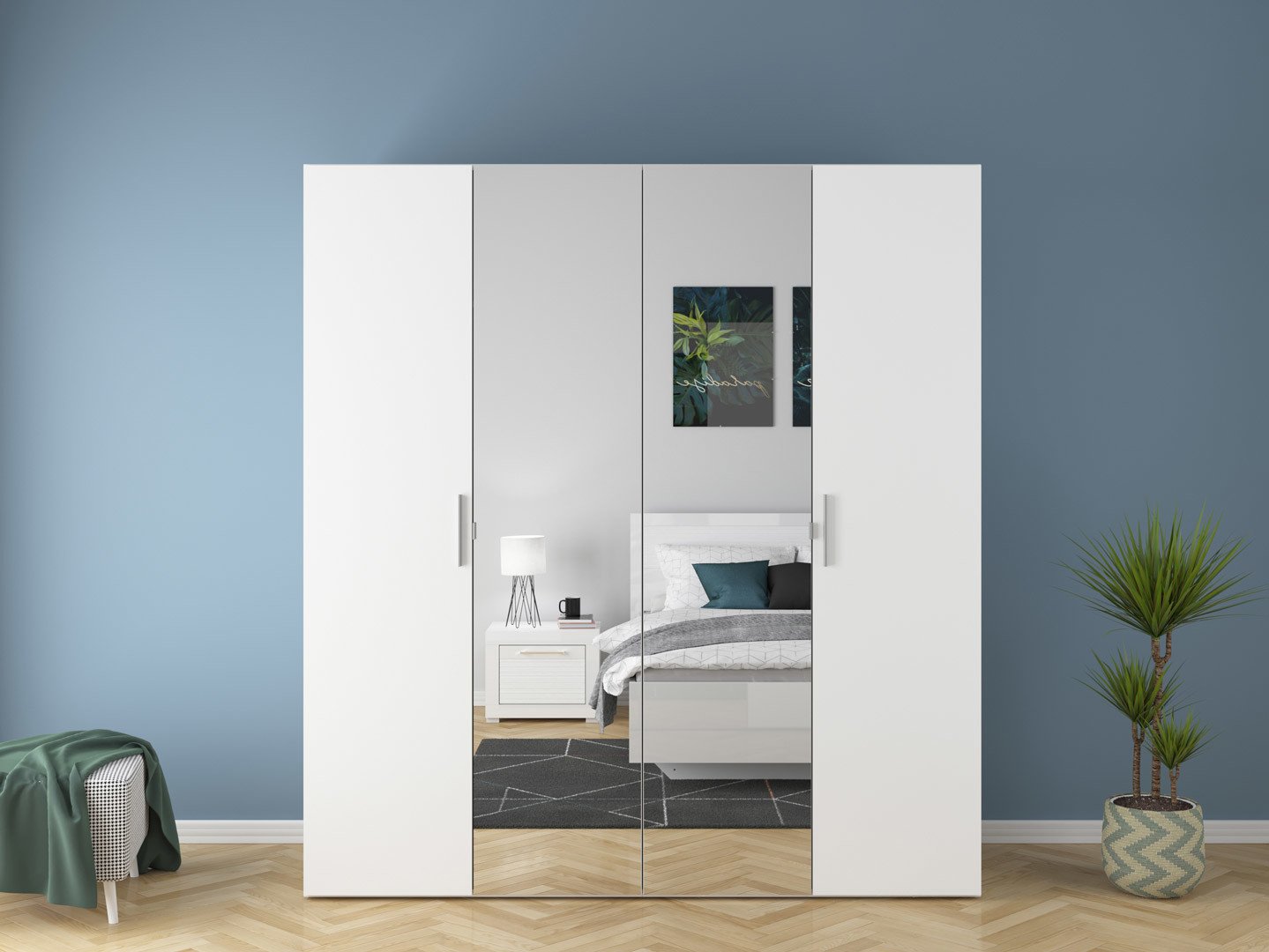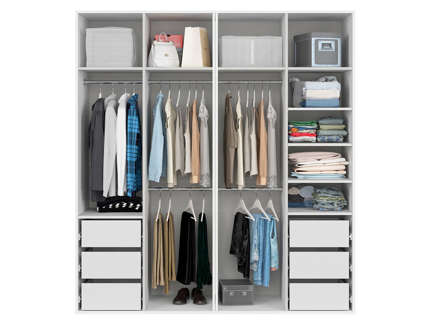 Flex Wardrobe – Organization with Elegance. Do you often wonder how to maintain order in a married couple’s bedroom? The Flex Wardrobe was created for a couple who want to maintain harmony in their wardrobe space. Its functionality and elegant design make it the perfect solution for shared clothing storage. The wardrobe’s dimensions (200 x 218 x 68 cm) allow for storage of a large amount of clothing, while simultaneously creating a light and airy feel. Two mirrored panels visually enlarge the space and give the interior an elegant character. Symmetrical handles add subtlety and a tasteful finish. The wardrobe’s interior is a true oasis of order. Six drawers, seven shelves of varying heights, and metal hanging rails with five separate compartments are the perfect solution for two people. Each rail can be adjusted to individual needs, making it easier to maintain order. Ball-bearing drawer slides guarantee full extension, and the soft-close function makes using the wardrobe comfortable and silent. The gray canvas color scheme of the wardrobe interior and its accessories create a harmonious whole. The robust construction of the Flex wardrobe is easy to keep clean, and the mirrored panels can be easily cleaned with a microfiber cloth and glass cleaner. The fronts, made of particleboard covered with a finish foil, are scratch-resistant, ensuring the furniture’s long-lasting aesthetic. The Flex wardrobe is not only a practical solution for a couple but also an elegant element of bedroom decor. By choosing the Flex wardrobe, you choose a combination of functionality, design, and durability. This piece of furniture meets expectations in both practical and aesthetic terms.
