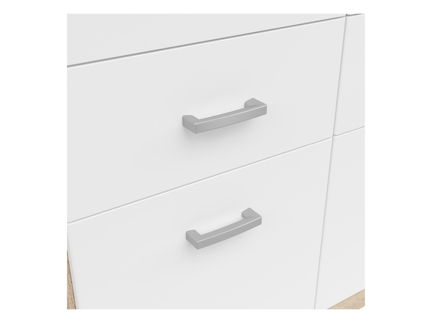 The Brando 4 Wardrobe – a revolution in space organization. Have you dreamed of a piece of furniture that not only looks great in your home but also helps you maintain order? The Brando 4 wardrobe is the answer to your needs, offering exceptional aesthetics combined with practical solutions. The first thing that catches your eye are the spacious shelves behind the outermost doors. They provide the perfect place to store clothes, towels, shoes, books, and documents. They keep everything organized and give you easy access to your essentials. The Brando 4 wardrobe is a key element of everyday organization. The middle door conceals a space with a hanging rail, dedicated to delicate fabrics. Hang your clothes in this section to avoid creases and free up time for more enjoyable activities. Now your wardrobe will become a place where order goes hand in hand with elegance. Not to be forgotten are the eight practical drawers in the lower section of the wardrobe. The four shallower ones are perfect for storing underwear, socks, or small accessories you want to always have close at hand. Four deeper drawers will hold bedding or blankets, ensuring your bedroom always looks tidy. The aesthetic design of the Brando 4 wardrobe combines a fashionable shade of artisan oak with an elegant matte white. A practical mirror adorns the central door fronts, making daily preparations easier. Silver handles complement the overall design perfectly, giving the piece a modern character. In short, the Brando 4 wardrobe is more than just a storage unit; it’s a true revolution in space organization. Simple, modern design goes hand in hand with functionality, adding a unique charm and elegance to the room. It’s not just a piece of furniture, it’s a lifestyle!