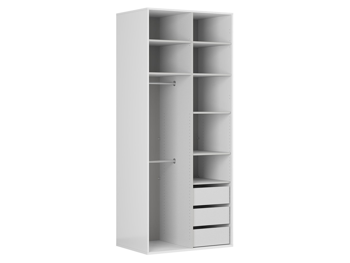 The Flex Wardrobe – Modernity and Style in Your InteriorThe Flex Wardrobe is a true gem for those who follow the “less is more” principle. Its simple, minimalist design combined with functionality make it an indispensable element in many rooms. The wardrobe’s two-door construction, with a white body and graphite front frames, lends the interior an elegant and clean feel. Subtle yet durable point handles complement the overall design perfectly. The gray linen interior adds practicality, creating a neutral backdrop for stored items. The Flex Wardrobe was created with a variety of rooms in mind, from the hallway to the bedroom or dressing room. Two rails allow for convenient hanging of shirts, jackets, or outerwear without the risk of creasing. Seven spacious shelves provide the perfect storage space for clothes and other small items. Three drawers at the bottom, equipped with a soft-close mechanism and full extension, provide practical storage for underwear, socks, and other small items. The Flex wardrobe perfectly combines modern aesthetics with functionality. Its compact dimensions make it suitable even for rooms with limited space, while still providing ample storage space. This unique piece of furniture not only serves a practical purpose but also adds a fresh and airy feel to any interior.