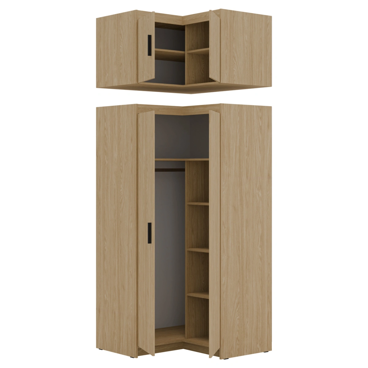 The corner wardrobe is made of laminated board and features a shelf with a clothes rail underneath and shelves on the other side.