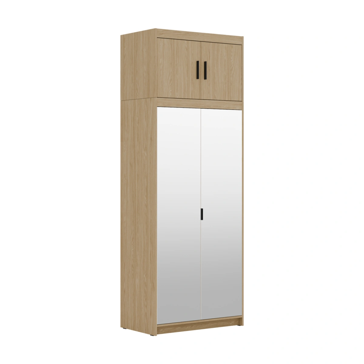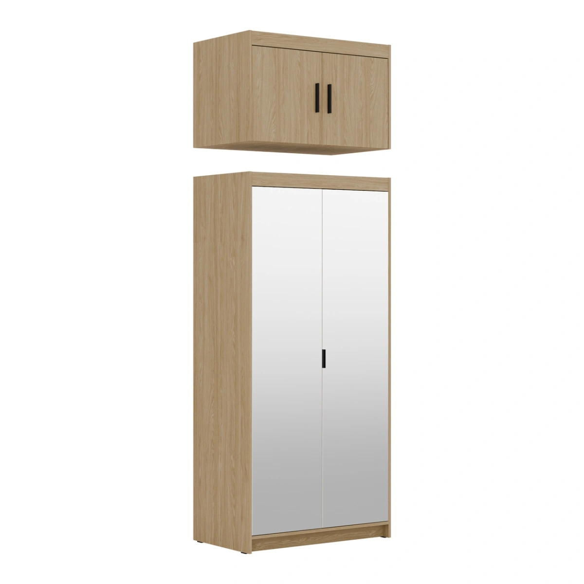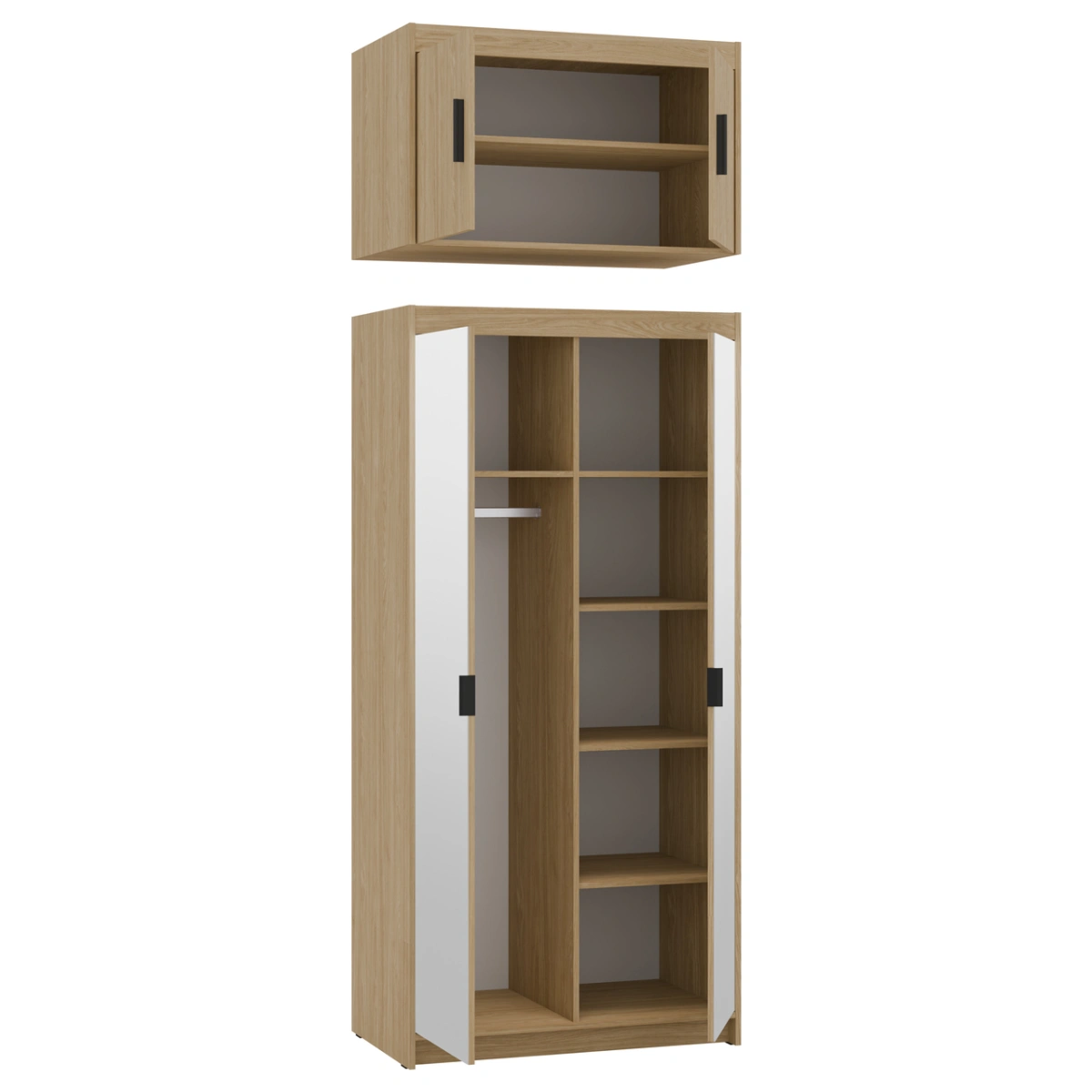 The two-door wardrobe is made of laminated board and features a shelf, a clothes rail underneath, and four additional shelves.