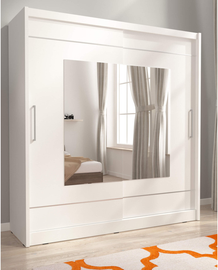 Maja 9 spinta, dvidurė, 200 cm, stumdomos, lentynos, pakaba, veidrodžiai, balta
