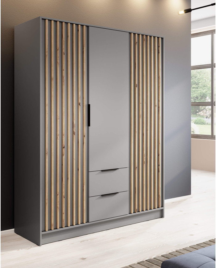 Nelly 3D spinta, 3 durys, 155 cm, lentynos, pakaba, stalčiai, pilka/artisan ąžuolas
