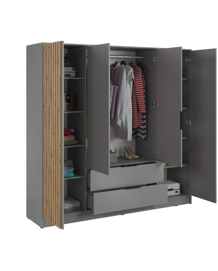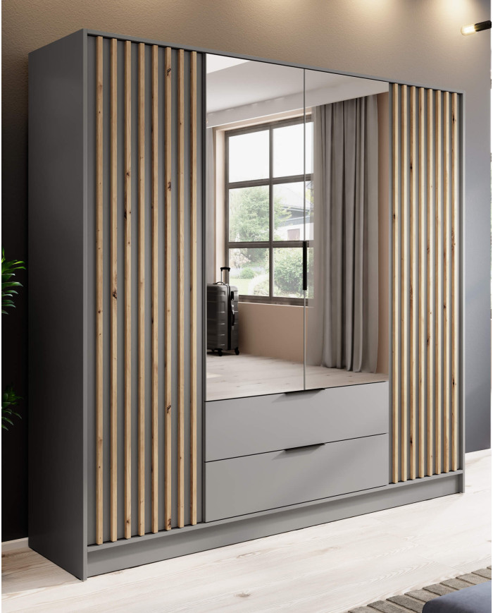 The four-door Nelly 4D wardrobe, with two large external mirrors, highlights its modern design with grooved fronts in Artisan Oak against a gray background. This piece is perfect for contemporary bedrooms, living rooms, and hallways, and thanks to the included mirrors, it visually enlarges the space. The interior of the set contains shelves for clothing and large boxes, as well as a hanging rail for long and short clothes. Two spacious external drawers with easy access provide space for organized storage of small items, belongings, and underwear. The wardrobe is constructed from laminated furniture board in a gray finish, featuring increased scratch resistance. The furniture is delivered ready for assembly, complete with a set of fittings and clear instructions. The set can be expanded with an additional extension unit. The option to purchase this extension unit is available in the product creator.