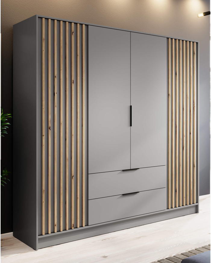 The large, four-door Nelly 4D wardrobe accentuates its modern design with distinctive, grooved fronts in Artisan Oak against a gray background. This piece is perfect for contemporary bedrooms, living rooms, and hallways. The interior features shelving for clothing and large boxes, as well as a hanging rail for long and short garments. Two spacious and highly functional outer drawers provide space for organized storage of small items, belongings, and underwear. The wardrobe is constructed from laminated furniture board in a gray finish, which is characterized by increased scratch resistance. The furniture is delivered disassembled, with a set of fittings and clear instructions. The set can be expanded with an additional extension unit. The option to purchase this extension unit is available in the product creator.