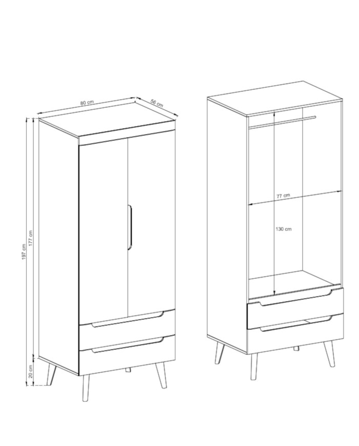 The Nordi NSZ80 wardrobe features two hinged doors, behind which lies a hanging rail for long and short garments. The lower section of the wardrobe features two practical and easily accessible drawers, ensuring proper organization of small items and linens. The wardrobe is made of durable MDF board for the front and laminated furniture board for the body, which is highly scratch-resistant. The set is delivered flat-packed with easy-to-follow assembly instructions. Artisan Oak/Black is also available.
