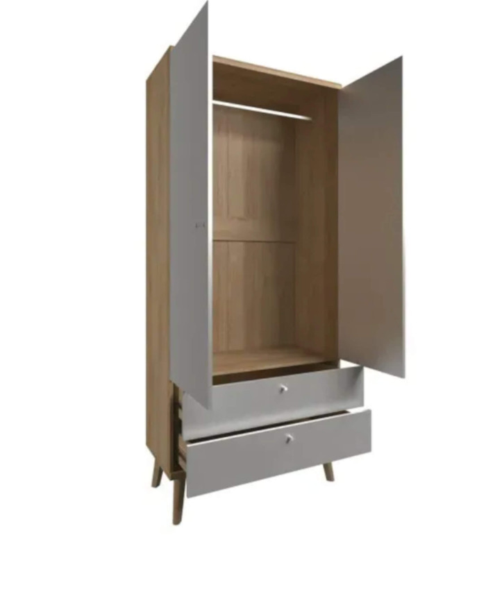 The Primo PSZ80 wardrobe, with high (20 cm) wooden legs, features two hinged doors, behind which there is a hanging rail for long and short clothes. The lower section of the wardrobe features two practical and easily accessible drawers, ensuring organized storage of small items, underwear, and knick-knacks. The wardrobe is made of durable laminated furniture board, featuring increased scratch resistance. Decorative elements are made of durable MDF. The set is delivered flat-packed with instructions and hardware.