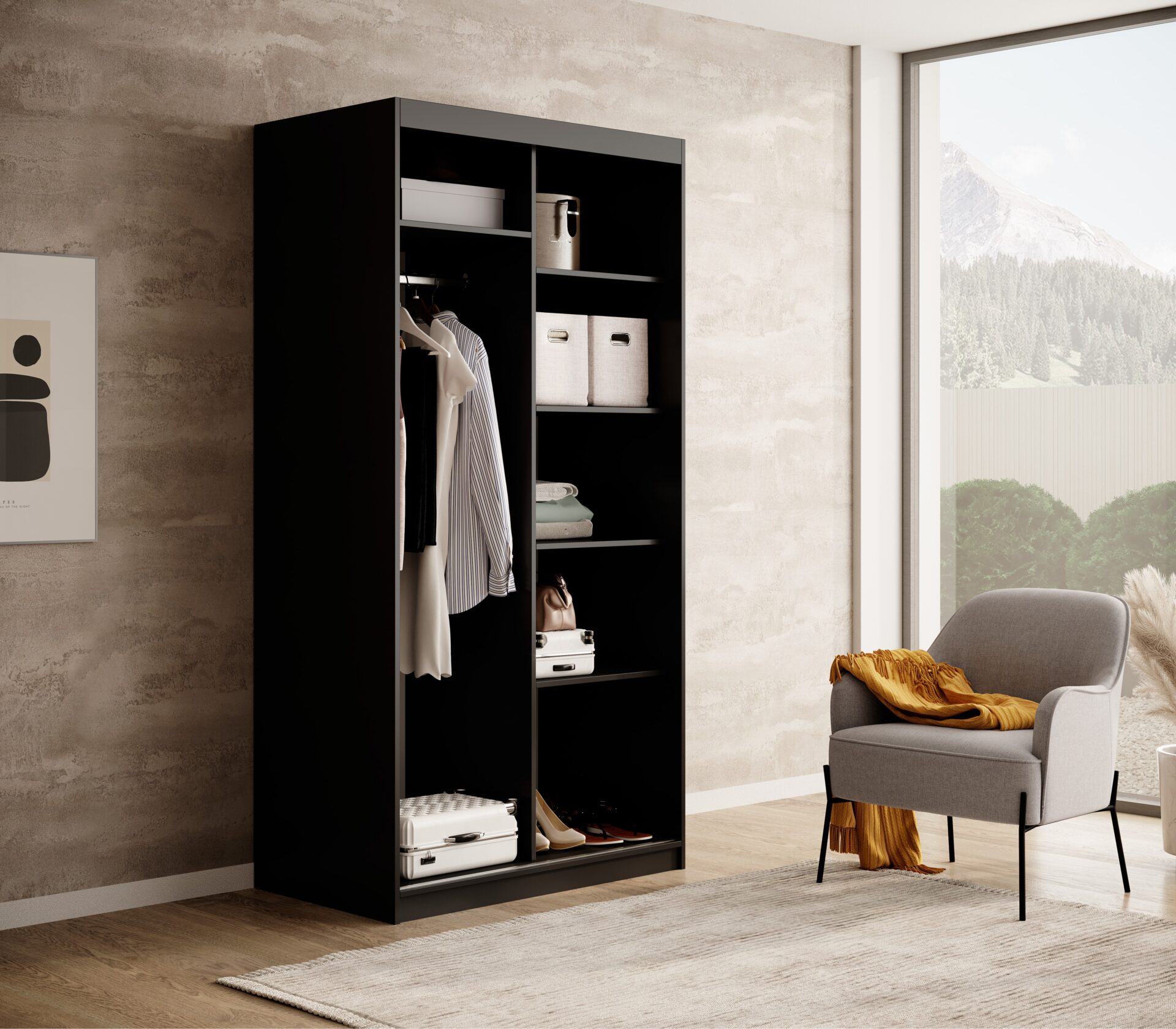The Delia sliding wardrobe with wood-colored slats is a stylish and practical solution for storing clothes and other items in your home. Its elegant wood-colored design adds warmth and coziness to any space, while also complementing a wide range of interior designs. The wardrobe doors are made of slats, adding a light and modern touch.