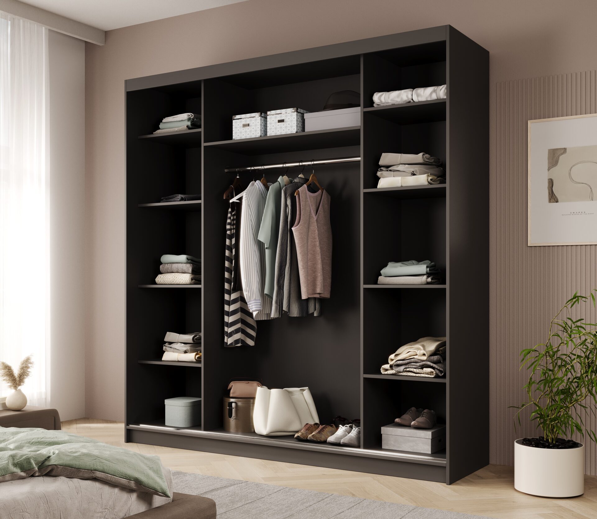 The Greta 200 sliding wardrobe is a modern and functional solution that will perfectly complement any bedroom, dressing room, or hallway. Its minimalist form, geometric front divisions, and meticulous finish give the interior an elegant and timeless character. Crafted from high-quality 16 mm laminated board, it is scratch-, moisture-, and UV-resistant, ensuring durability and aesthetics for years to come. The wardrobe features a sliding door system that allows for easy opening and closing while saving space—an ideal solution for smaller spaces. The wardrobe’s interior has been designed with maximum functionality in mind, featuring a set of shelves and rails that make it easy to organize clothes, accessories, and other everyday items. The Greta 200 model is available in five color options: classic white, elegant black, a modern white and black combination, black and white, and a fashionable cashmere shade.