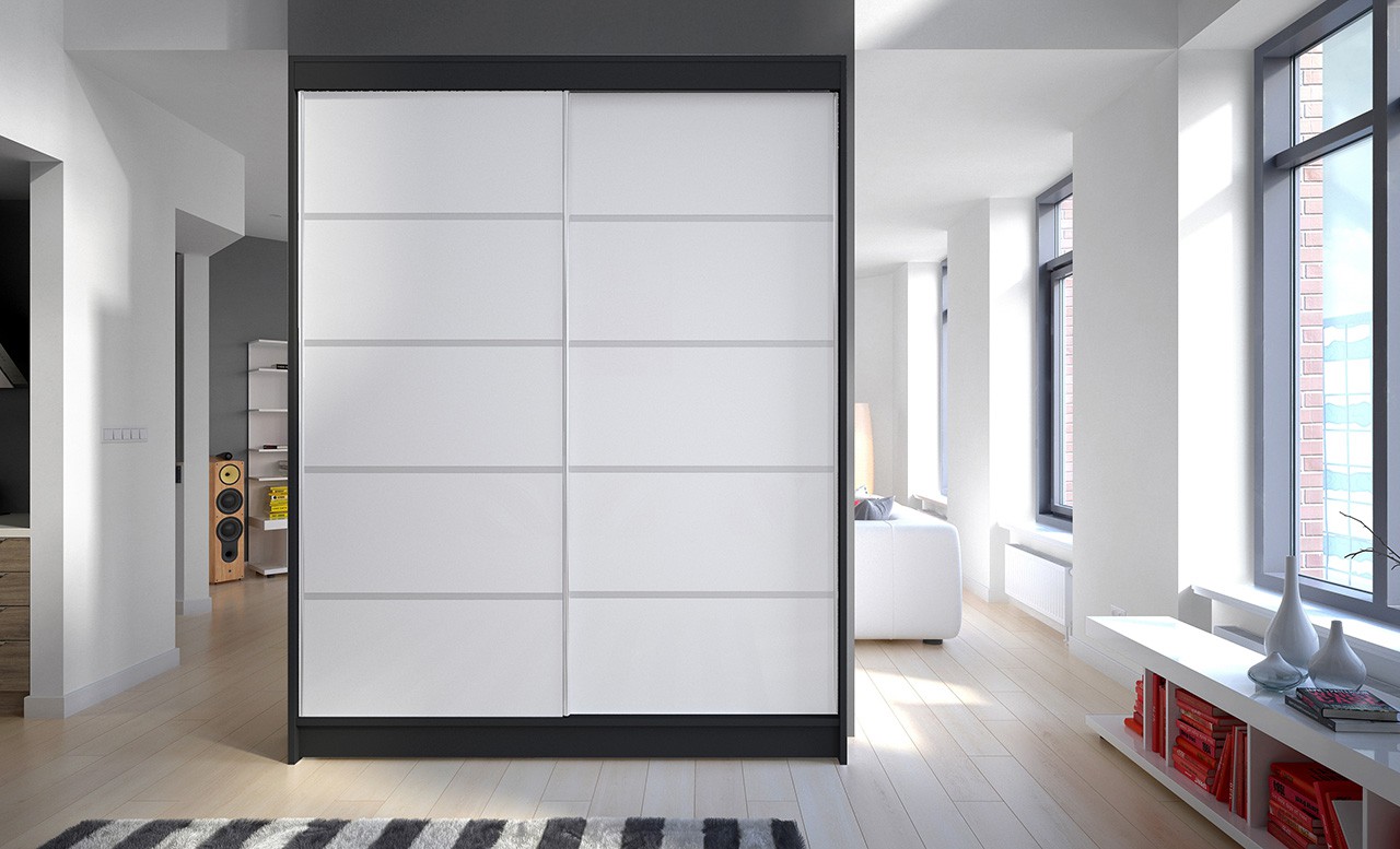 The LUFT sliding wardrobe is the perfect way to organize your space. It features spacious shelves and a hanging rail for dresses, suits, outerwear, and shirts. The front features distinctive silver horizontal stripes that add a unique style to the piece. Because the wardrobe is sliding, you don’t need to create extra space to open the doors, making it a perfect solution for a small room or narrow hallway.
