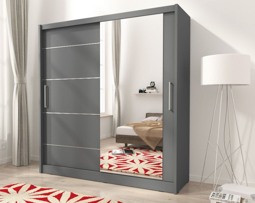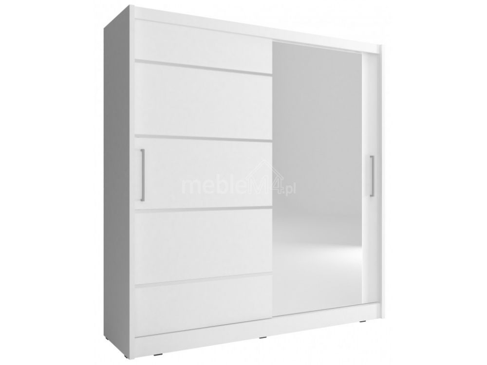 The MAJA I ALU wardrobe is made of high-quality 16 mm thick laminated board with ABS veneer edges. The base is made of MDF. It features a hanging rail and numerous shelves – the interior layout is shown in the photo. This wardrobe is perfect for storing clothes.
