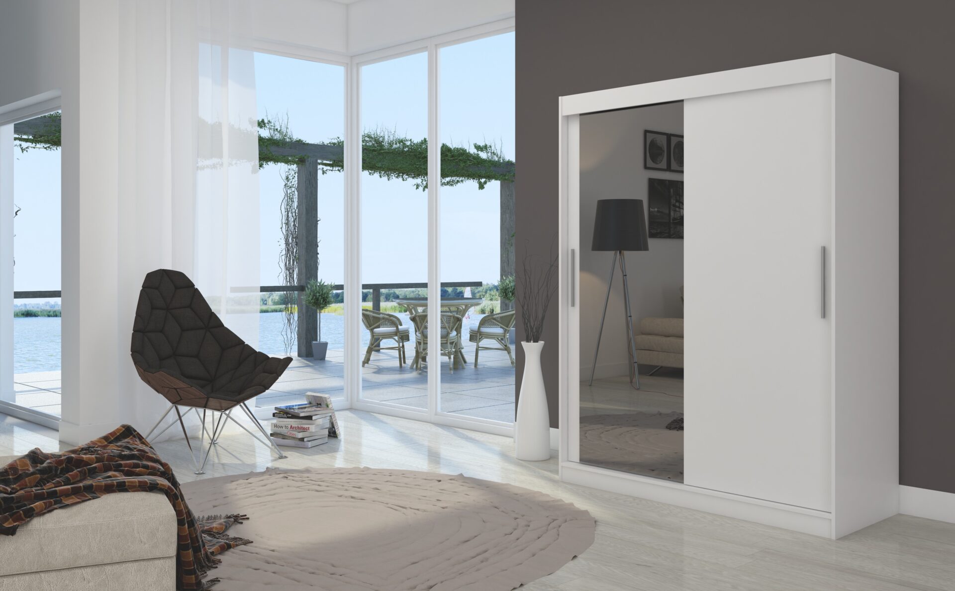 The BIANCO sliding wardrobe with mirror is the perfect way to organize your space. It features spacious shelves and a hanging rail for dresses, suits, outerwear, and shirts. A mirror attached to the front visually enlarges the space. Because the wardrobe is sliding, you don’t need to create extra space to open the doors, making it a perfect solution for a small room or narrow hallway.