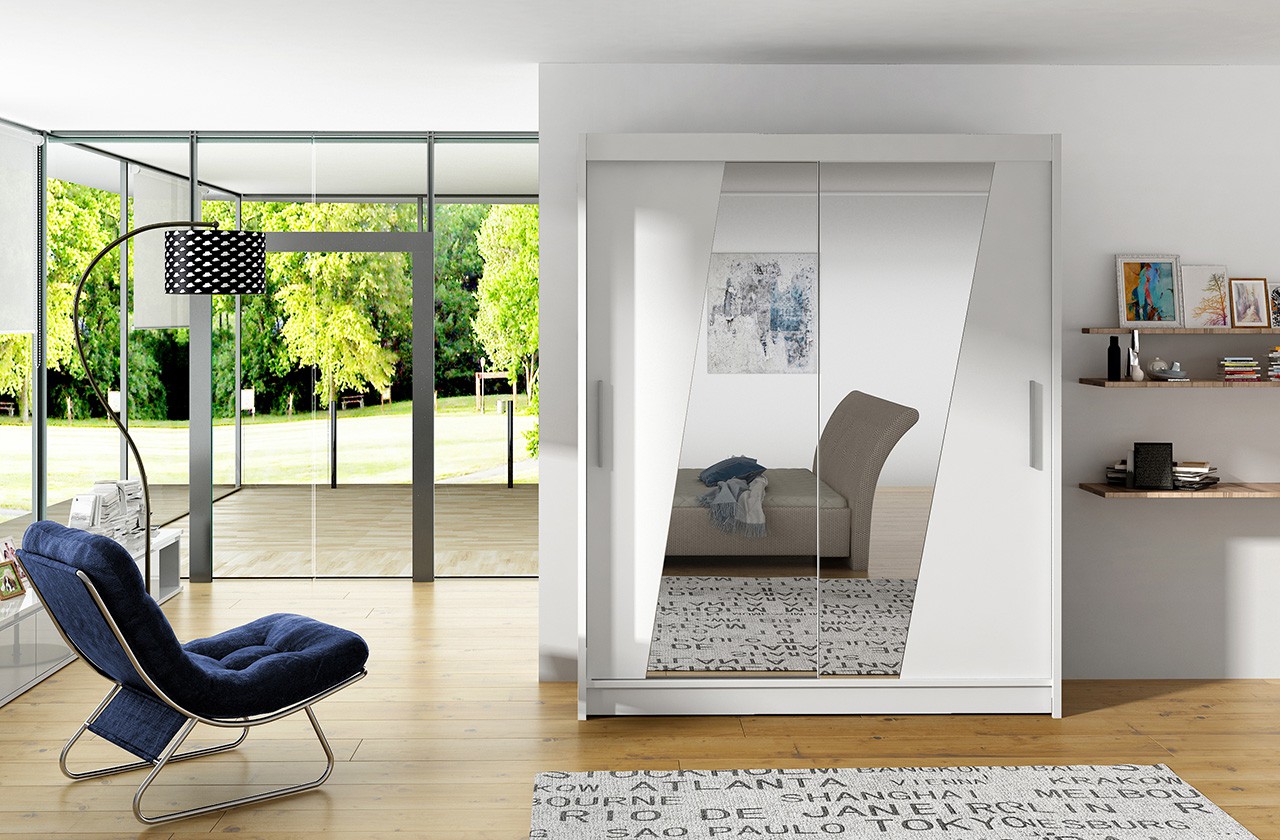 The BOLTON sliding wardrobe with mirror is the perfect way to organize your space. It features spacious shelves and a hanging rail for dresses, suits, outerwear, and shirts. A mirror attached to the front visually enlarges the space. Because the wardrobe is sliding, you don’t need to create extra space to open the doors, making it a perfect solution for a small room or narrow hallway.