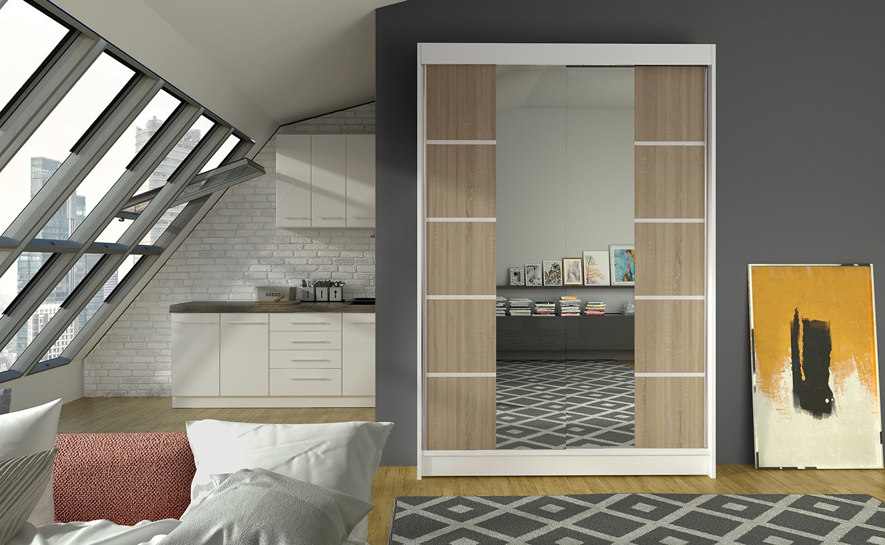 The GENUA sliding wardrobe with mirror is the perfect way to organize your space. It features spacious shelves and a hanging rail for dresses, suits, outerwear, and shirts. A mirror is attached to the front, visually enlarging the space. Because the wardrobe is sliding, you don’t need to create extra space to open the doors, making it a perfect solution for a small room or narrow hallway.