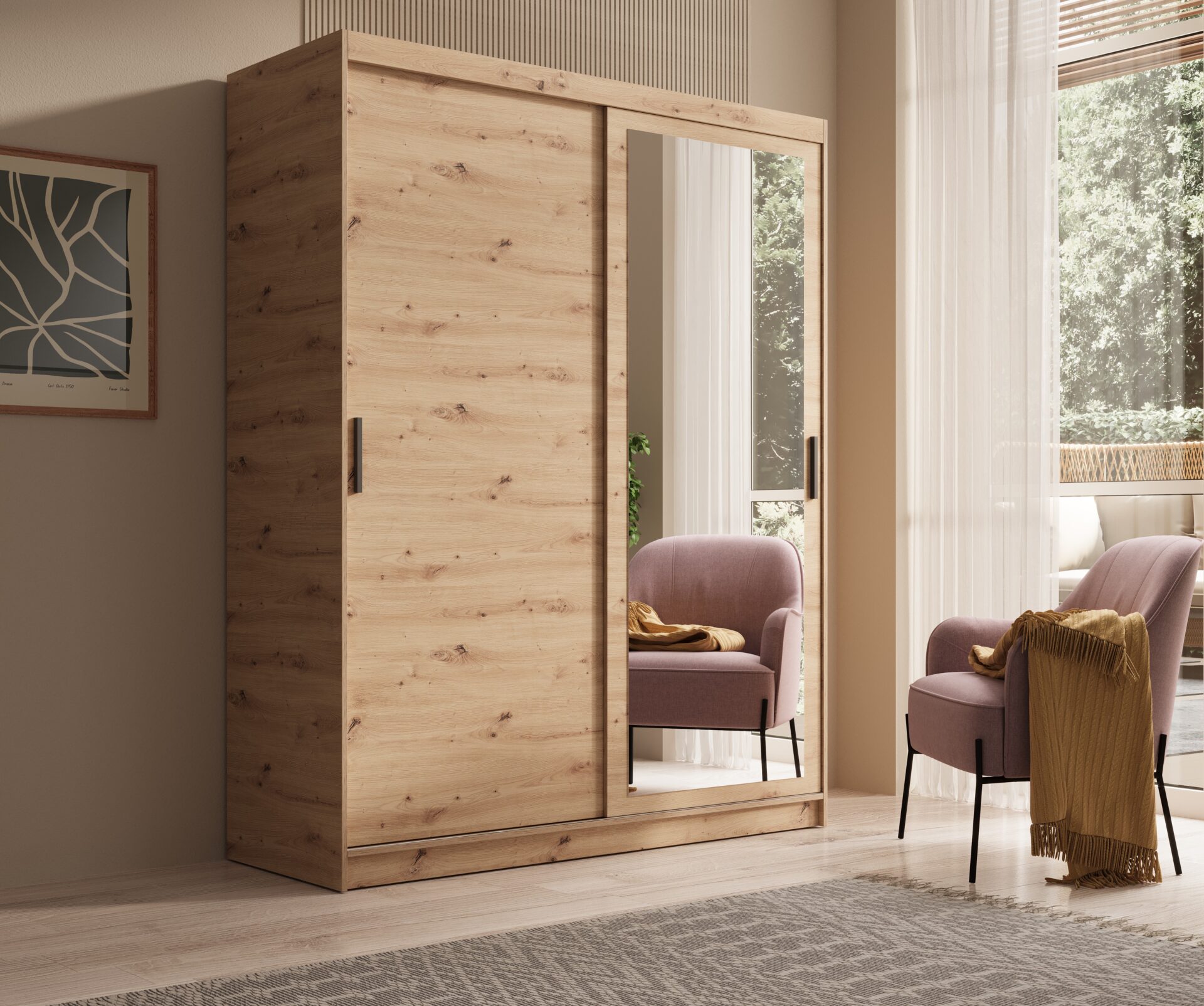 The Hailey sliding wardrobe is the perfect solution for those who value modern design and practical solutions. Its simple form and minimalist look will fit perfectly into any interior, adding elegance and spaciousness. The mirrored doors not only give the wardrobe a stylish character but also visually enlarge the room in which it is located. The Hailey wardrobe is available in four sizes: 100 cm, 120 cm, 160 cm, and 180 cm, allowing for a perfect fit in any space – from a cozy bedroom to a spacious hallway. The wardrobe’s interior is designed with maximum functionality in mind, providing space for hanging clothes and shelves for folded wardrobe items. Invest in a Hailey wardrobe and bring harmony, style, and order to your home.