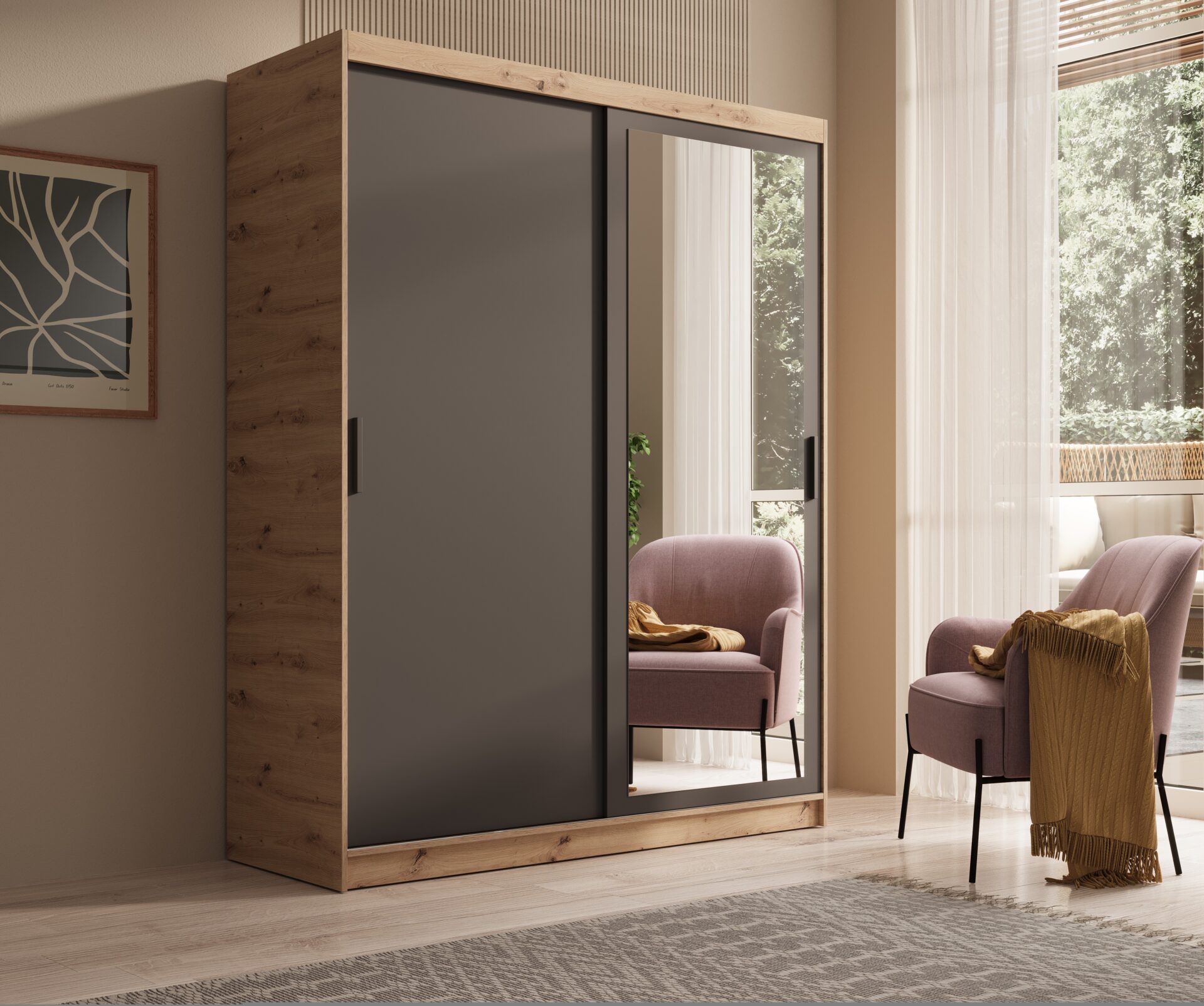 The Hailey sliding wardrobe is the perfect solution for those who value modern design and practical solutions. Its simple form and minimalist look will fit perfectly into any interior, adding elegance and spaciousness. The mirrored doors not only give the wardrobe a stylish character but also visually enlarge the room in which it is located. The Hailey wardrobe is available in four sizes: 100 cm, 120 cm, 160 cm, and 180 cm, allowing for a perfect fit in any space – from a cozy bedroom to a spacious hallway. The wardrobe’s interior is designed with maximum functionality in mind, providing space for hanging clothes and shelves for folded wardrobe items. Invest in a Hailey wardrobe and bring harmony, style, and order to your home.