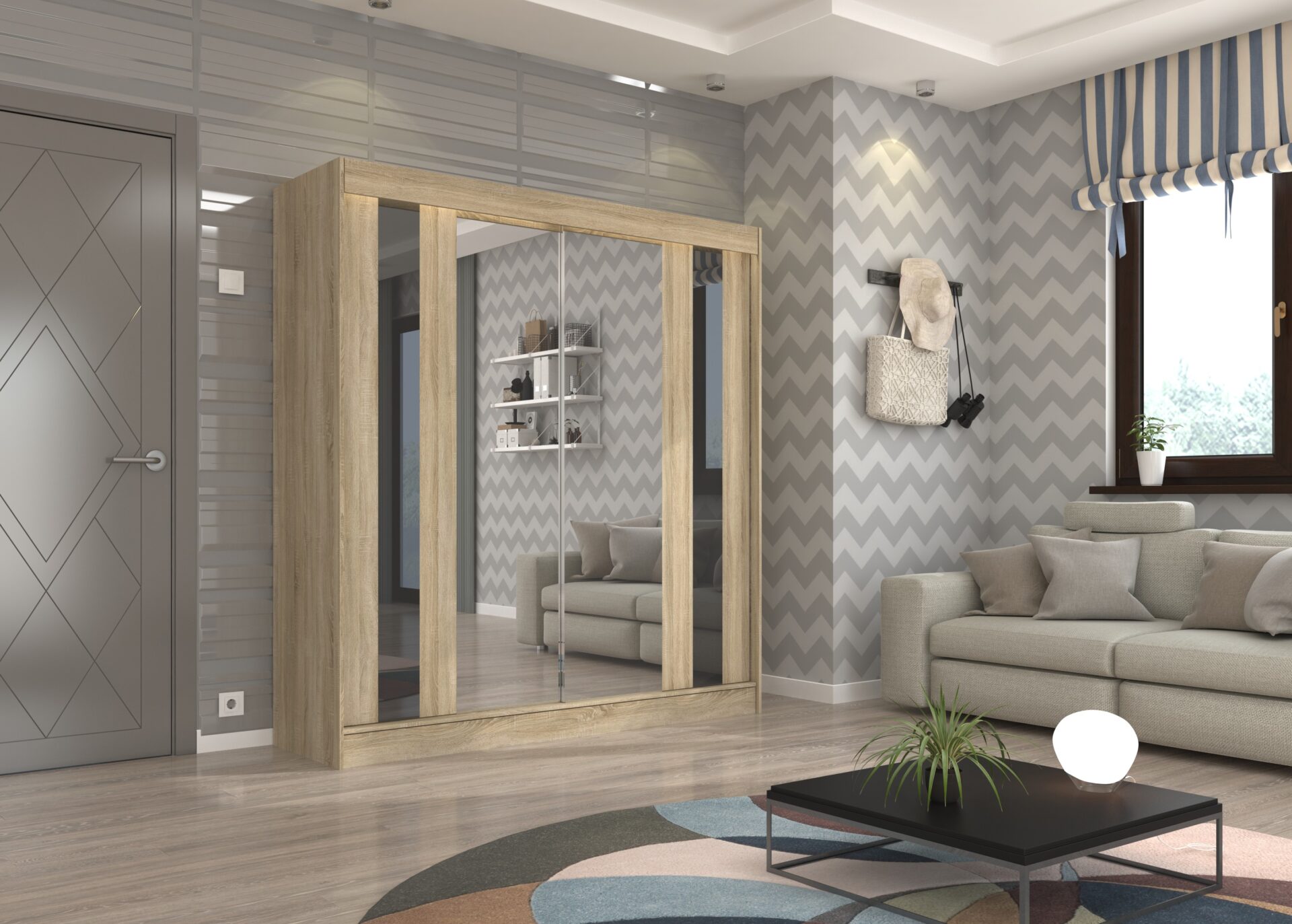 The KEITA sliding wardrobe is the perfect way to organize your space. It features spacious shelves and a hanging rail for dresses, suits, outerwear, and shirts. The front features a mirror and decorative lacobel accents, giving the piece a unique style. Because the wardrobe is sliding, you don’t need to create extra space to open the doors, making it a perfect solution for a small room or narrow hallway.