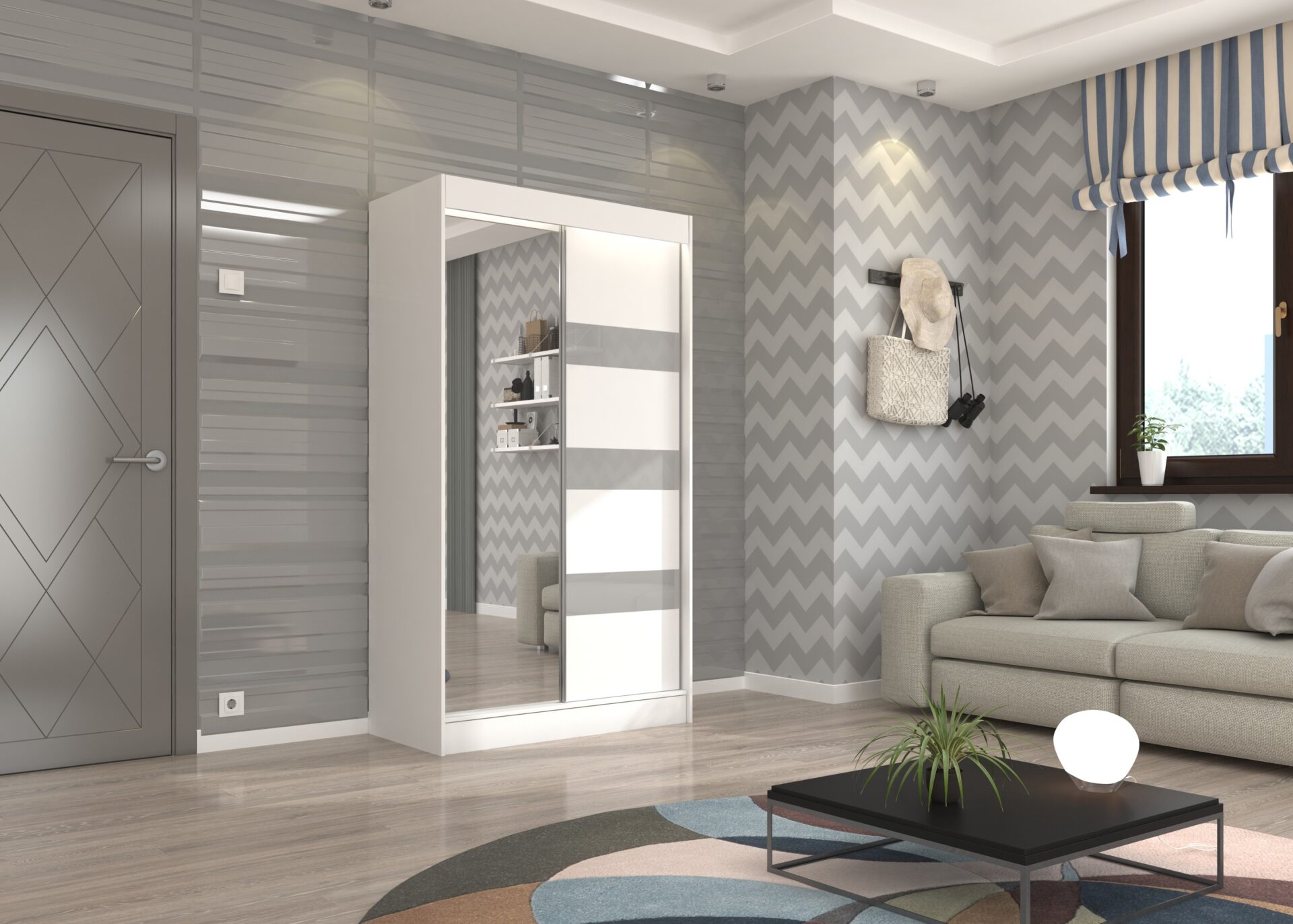 Stumdoma spinta su veidrodžiu ir lakobeliu TOURA 120 balta/pilka Lacobel ADRK