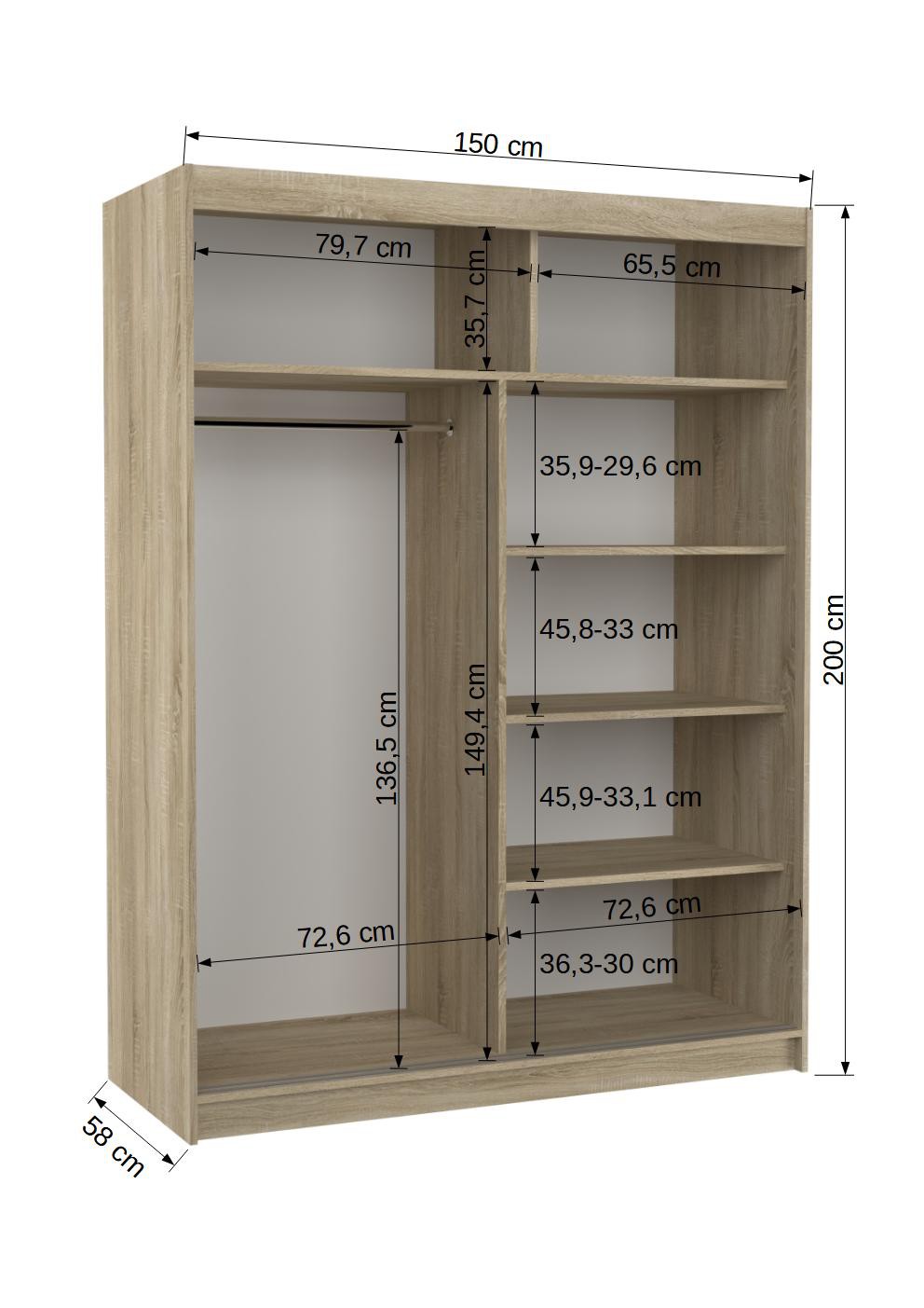 The BALTIC sliding wardrobe with mirror is the perfect way to organize your space. It features spacious shelves and a hanging rail for dresses, suits, outerwear, or shirts. Horizontal mirrors are attached to the front, visually enlarging the space while adding a unique touch of style. Because the wardrobe is sliding, you don’t need to create extra space to open the doors, making it a perfect solution for a small room or narrow hallway. A striking feature is the striking LED lighting, which adds a wonderful charm to both the wardrobe and the room.