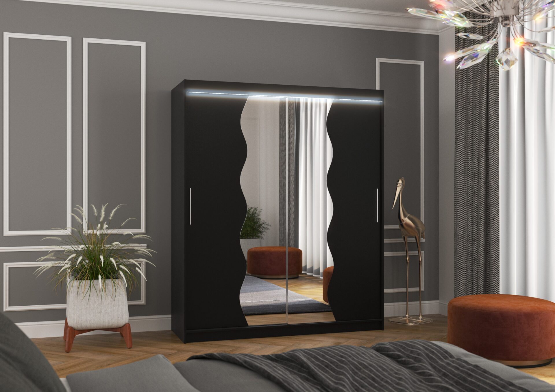 The KANSAS sliding wardrobe with mirror is the perfect way to organize your space. It features spacious shelves and a hanging rail for hanging dresses, suits, outerwear, or shirts. Mirrors are attached to the front, visually enlarging the space. Because the wardrobe is sliding, you don’t need to create extra space to open the doors, making it a perfect solution for a small room or narrow hallway. A striking feature is the striking LED lighting, which adds a wonderful charm to both the wardrobe and the room.