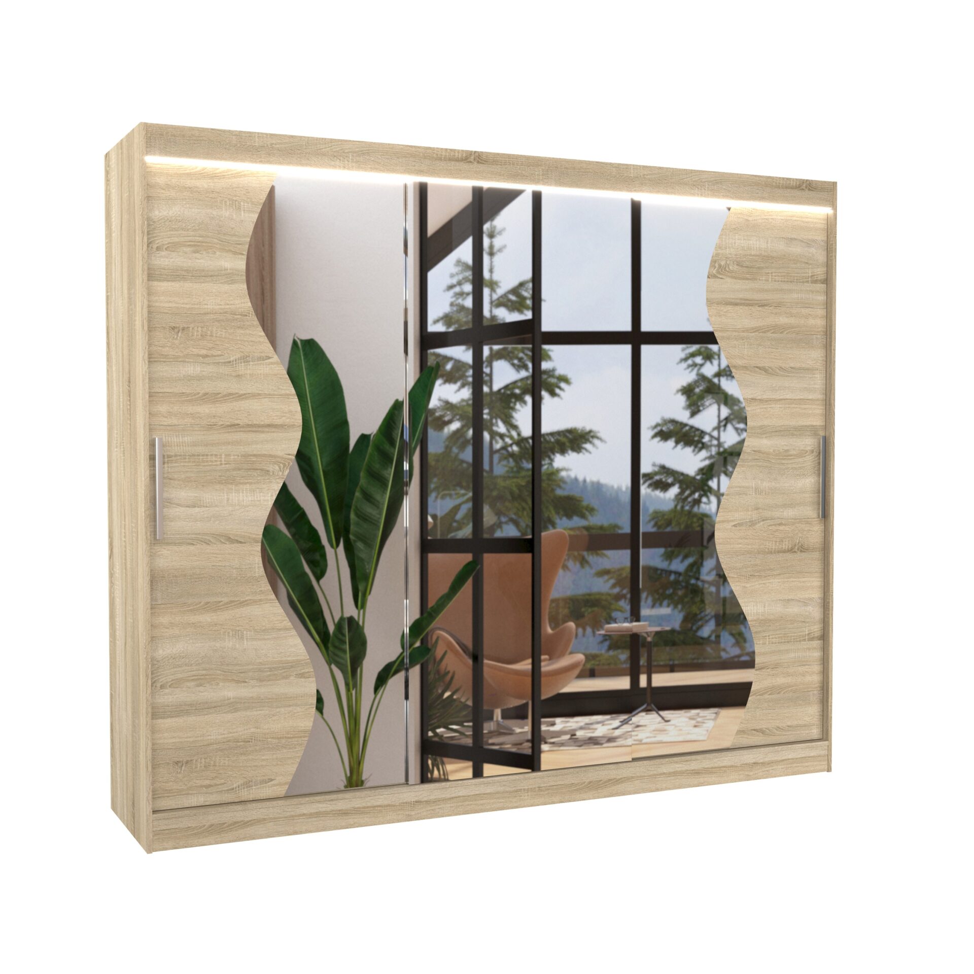The SHARON sliding wardrobe with mirror is the perfect way to organize your space. It features spacious shelves and a hanging rail for dresses, suits, outerwear, and shirts. A mirror attached to the front visually enlarges the space. Because the wardrobe is sliding, you don’t need to create extra space to open the doors, making it a perfect solution for a small room or narrow hallway. A striking feature is the striking LED lighting, which adds a wonderful charm to both the wardrobe and the room.