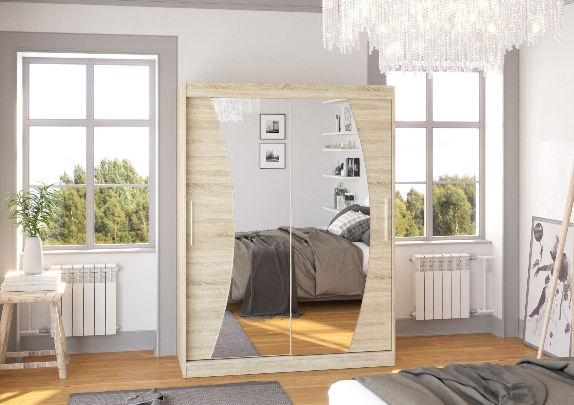 The MODESTO sliding wardrobe with mirror is the perfect way to organize your space. It features spacious shelves and a hanging rail for dresses, suits, outerwear, or shirts. A mirror attached to the front visually enlarges the space. Because the wardrobe is sliding, you don’t need to create extra space to open the doors, making it a perfect solution for a small room or narrow hallway.