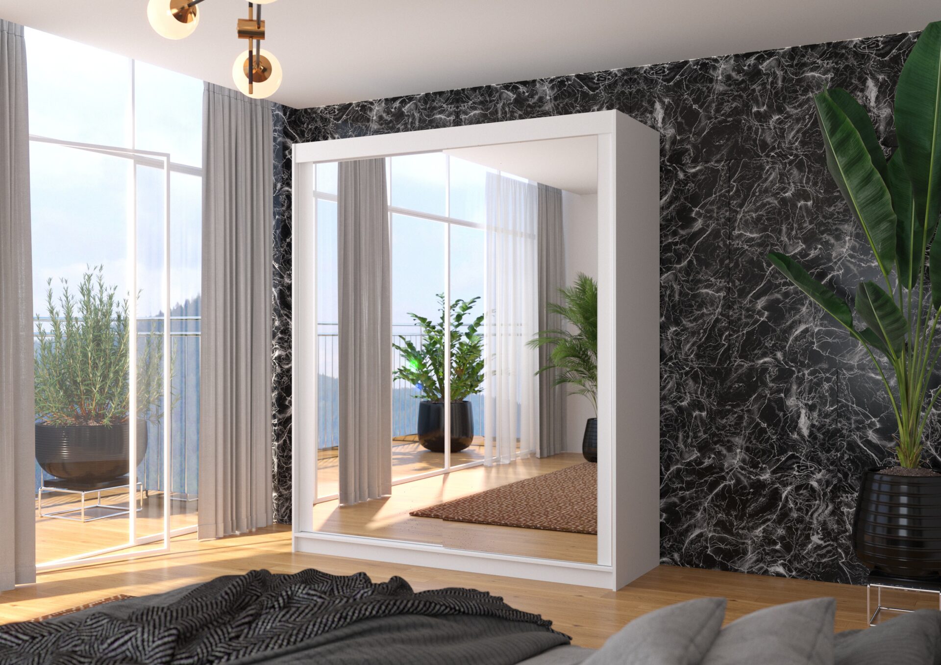 The MORGAN sliding wardrobe with mirror is the perfect way to organize your space. It features spacious shelves and a hanging rail for dresses, suits, outerwear, and shirts. Mirrors are attached to the front, visually enlarging the space. Because the wardrobe is sliding, you don’t need to create extra space to open the doors, making it a perfect solution for a small room or narrow hallway.