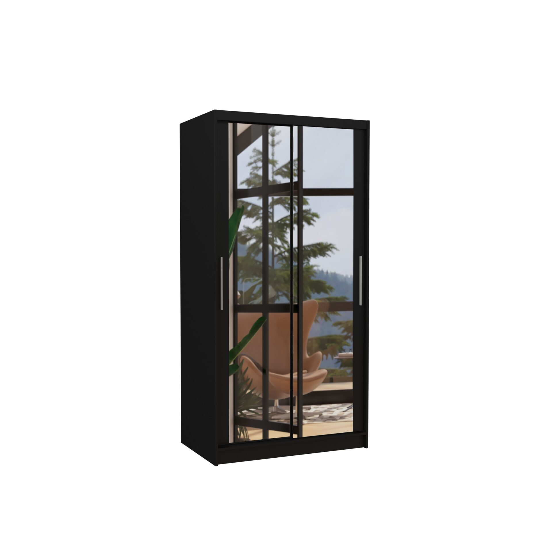 The NEVIO sliding wardrobe with mirror is the perfect way to organize your space. It features spacious shelves and a hanging rail for dresses, suits, outerwear, or shirts. Mirrors are attached to the front to visually enlarge the space. Because the wardrobe is sliding, you don’t need to create extra space to open the doors, making it a perfect solution for a small room or narrow hallway.