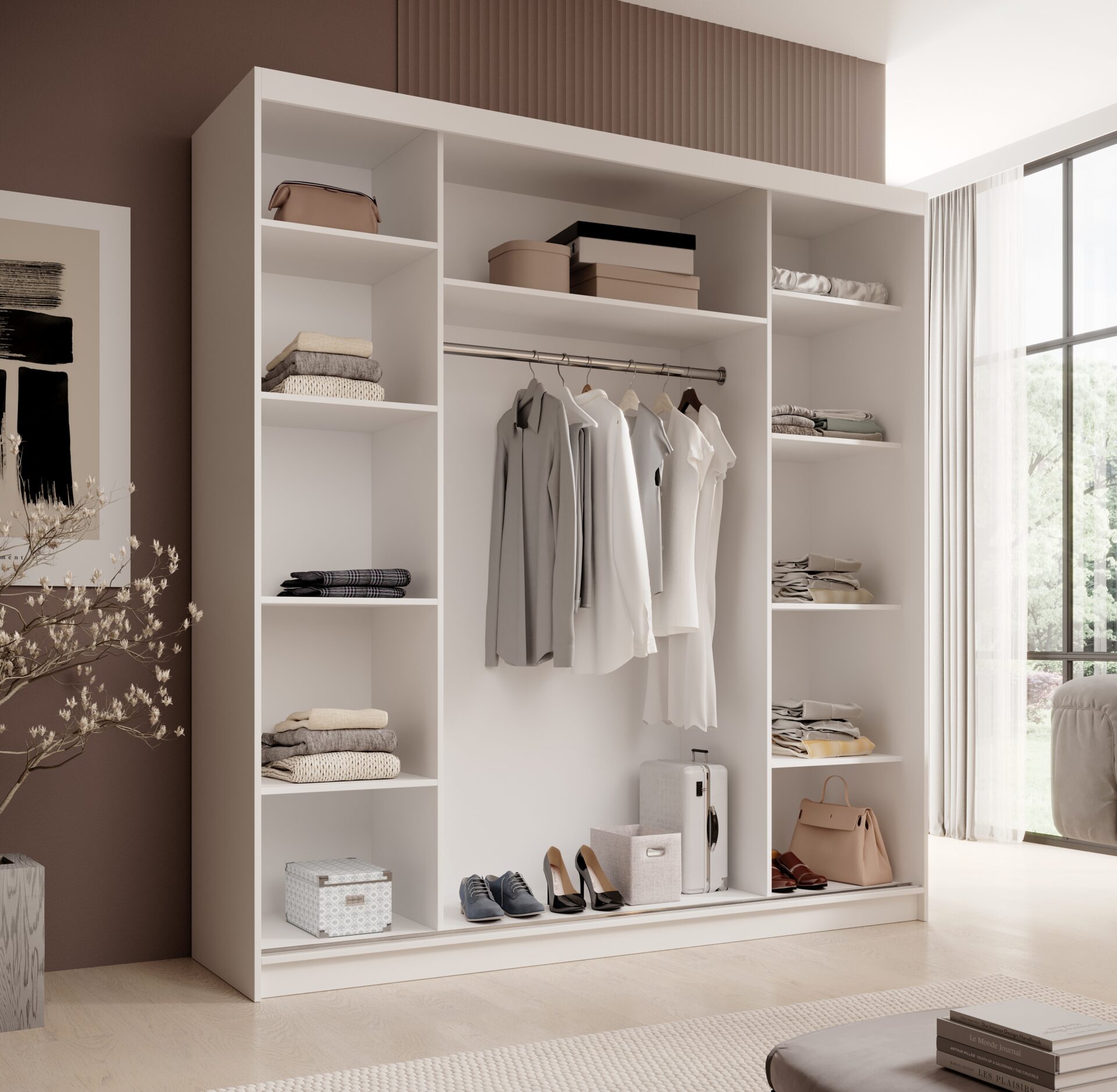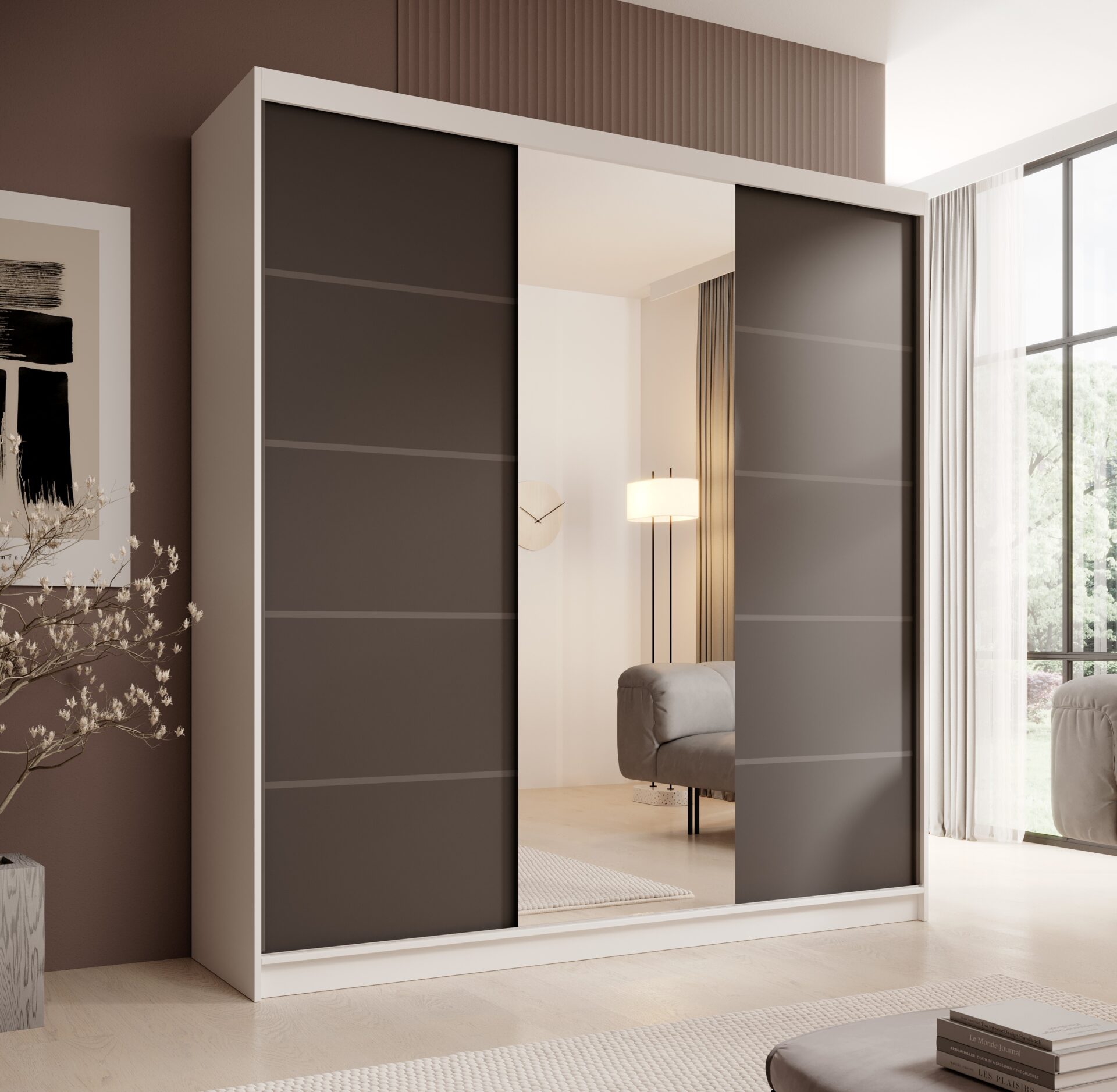The Sonic 200 mirrored wardrobe is a modern and functional piece of furniture, perfect for a bedroom, dressing room, or hallway. Its sliding doors facilitate everyday use and save space. The large, centrally placed mirror not only visually enlarges the space but also serves a practical purpose, making daily preparations easier. The Sonic wardrobe combines aesthetics with practicality, offering a spacious interior with shelves and a clothes rail, making it an excellent choice for modern interiors.