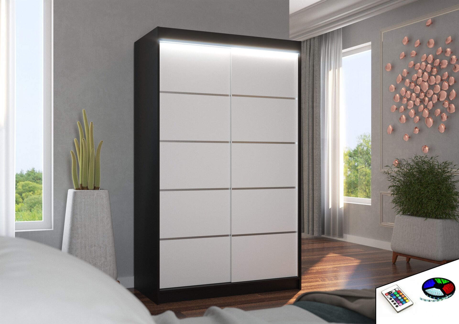 The BENISSO sliding wardrobe is the perfect way to organize your space. It features spacious shelves and a hanging rail for dresses, suits, outerwear, and shirts. Because the wardrobe is sliding, you don’t need to create extra space to open the doors, making it a perfect solution for a small room or narrow hallway. A striking feature is the striking LED lighting, which adds a wonderful charm to both the wardrobe and the room.