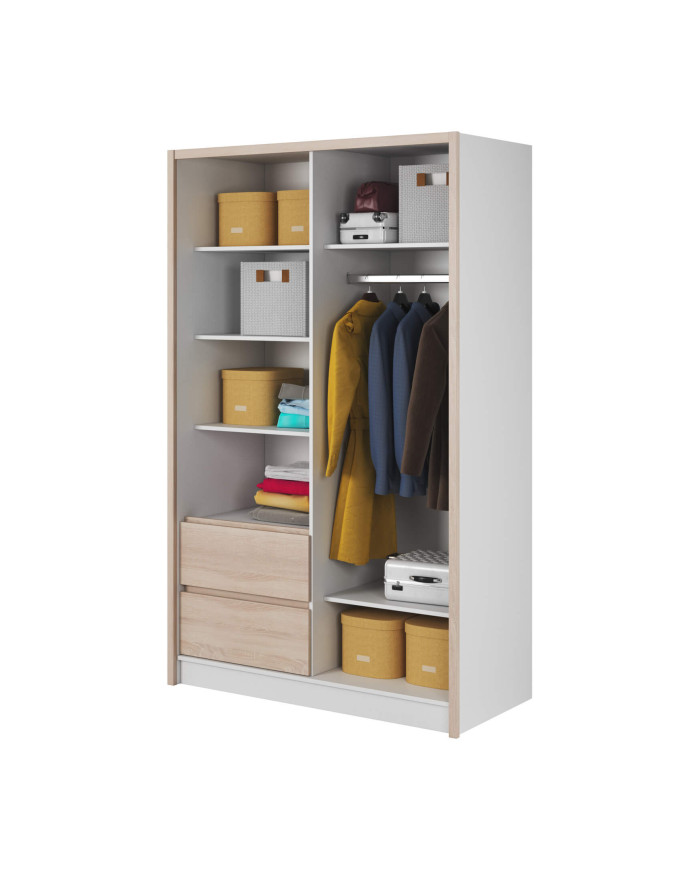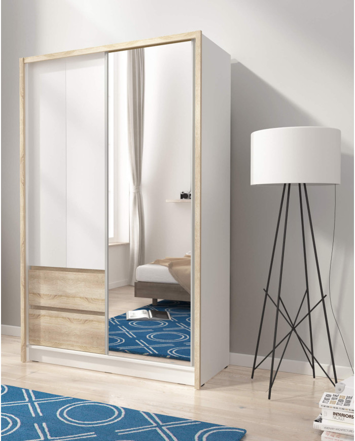 Sara spinta, dviejų durų, 134 cm, stumdomos, lentynos, pakaba, stalčiai, veidrodis, balta/Sonoma ąžuolas