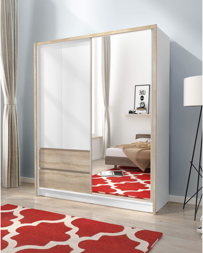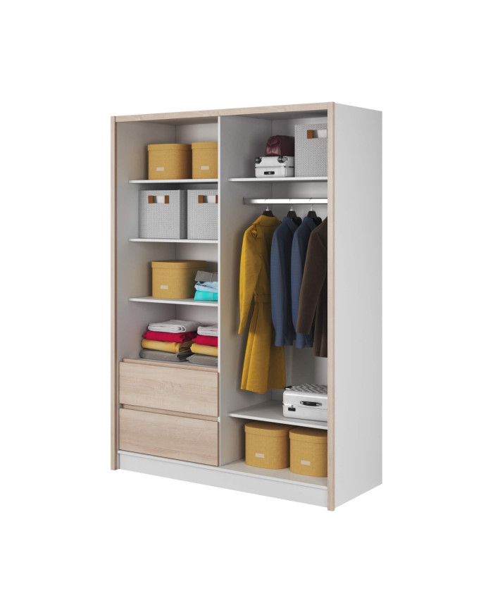 Sara spinta, dviejų durų, 154 cm, stumdomos, lentynos, pakaba, stalčiai, veidrodis, balta/Sonoma ąžuolas