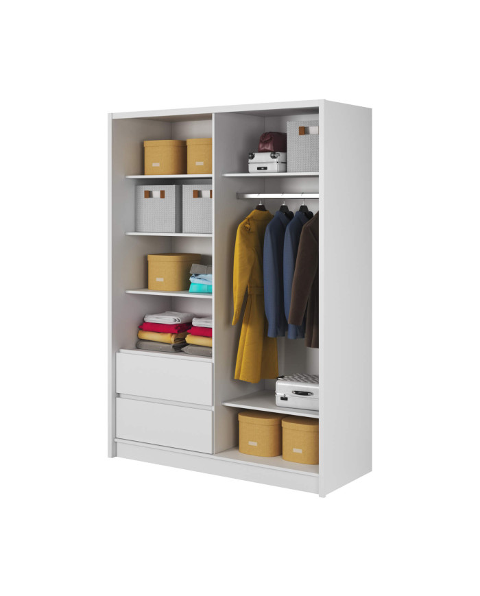 Sara spinta, dviejų durų, 154 cm, stumdomos, lentynos, pakabos karnizas, stalčiai, veidrodis, balta