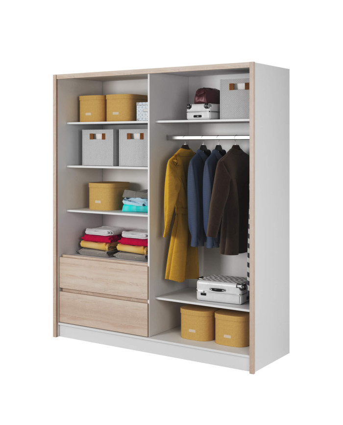 Sara spinta, dvidurė, 184 cm, stumdomos, lentynos, pakaba, stalčiai, veidrodis, balta/Sonoma ąžuolas