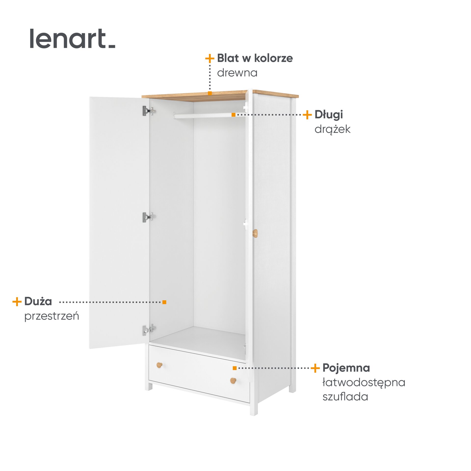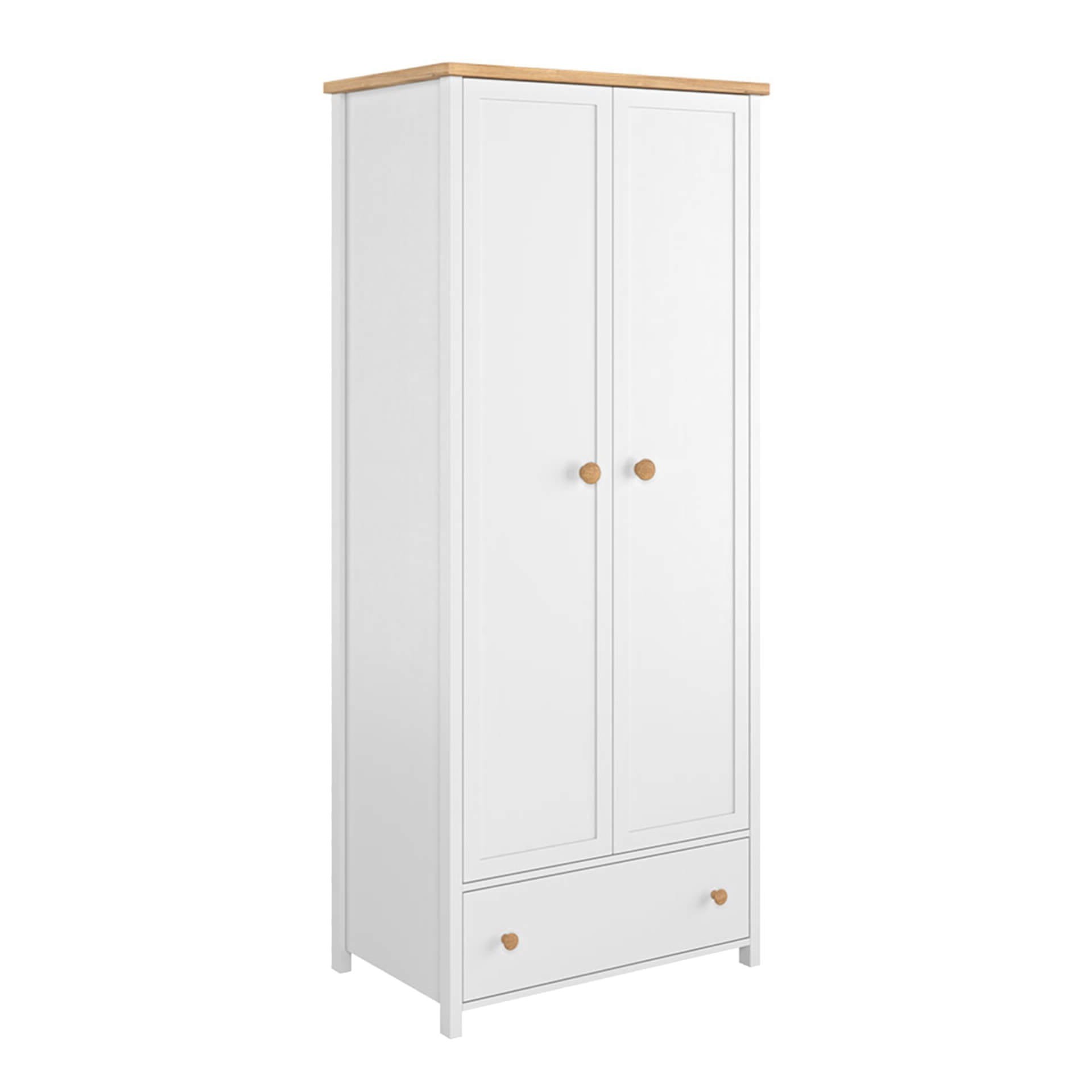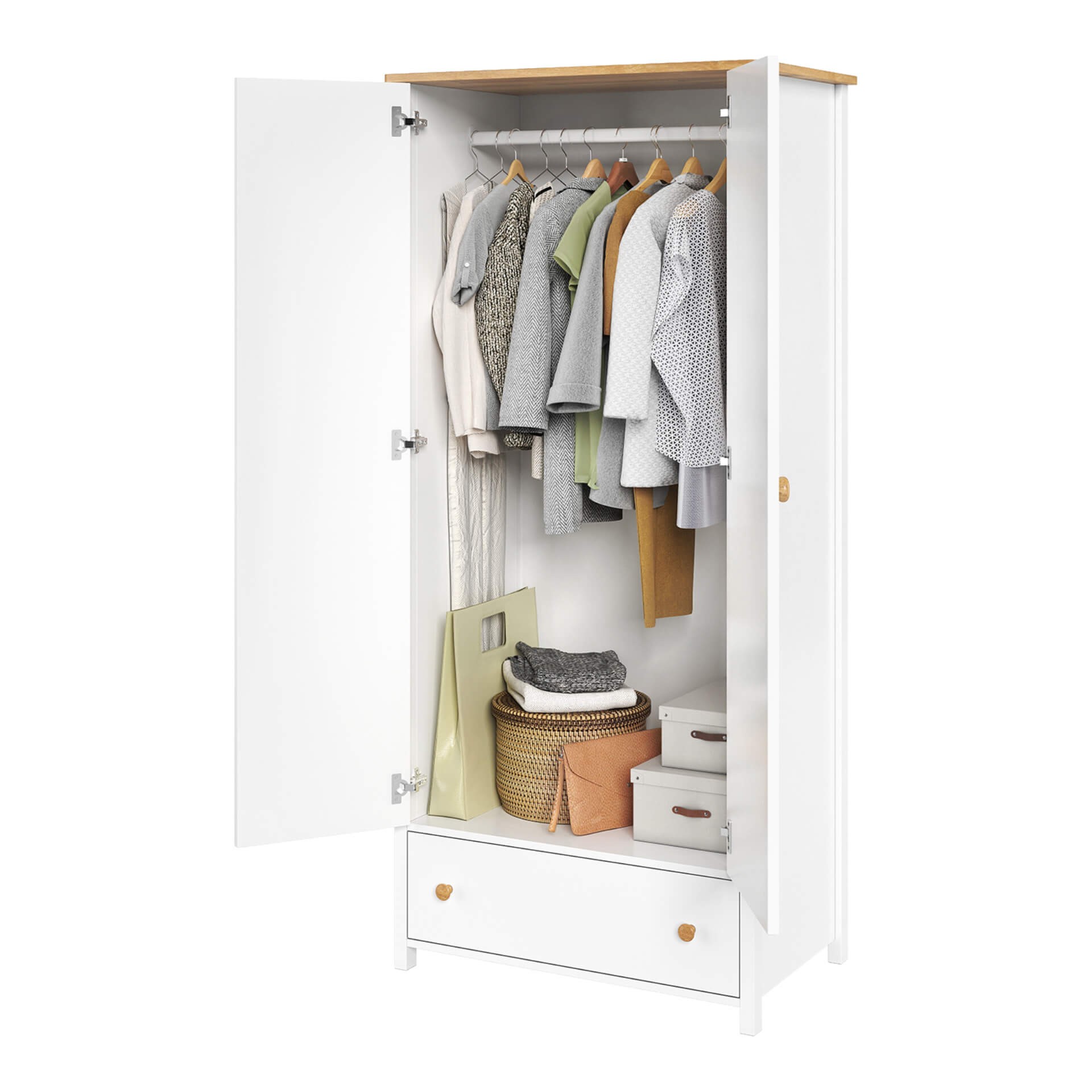 Model: SO-01 Color: white / nash oak Dimensions: Width: 85cm Height: 186cm Depth: 52cm Basic information: body name: SO-01 collection name: STORY body index: SO1BDN color: white / nash oak furniture type: wardrobe body characteristics: 2D1S width: 85 cm height: 186 cm depth: 52 cm body weight: 60 kg assembly: requires assembly collection style: modern type of interior 1: youth room type of interior 2: bedroom type of interior 3: wardrobe equipment: 1x rail number of drawers: 1 number of doors: 2 Fittings: hinge: concealed regular handle: plastic drawer guide: roller guide foot / leg: slide with a nail Material: body: laminated chipboard; 16mm; 25mm body edge finish: B 1.0mm body color: white / nash oak top: laminated chipboard; 25mm top edge finish: B 1.0mm number of veneered top edges: 4 top color: nash oak back wall: HDF board; 3mm visible back wall finish: laminate invisible back wall finish: raw back wall mounting: nut back wall color: white front: laminated chipboard; 16mm front edge finish: A 0.45mm front color: white drawer interior finish: white ribbon drawer bottom: HDF board; 3mm Important: This wardrobe is manufactured to individual customer order. Order cancellations are not possible after 48 hours of placing your order. Please shop carefully.