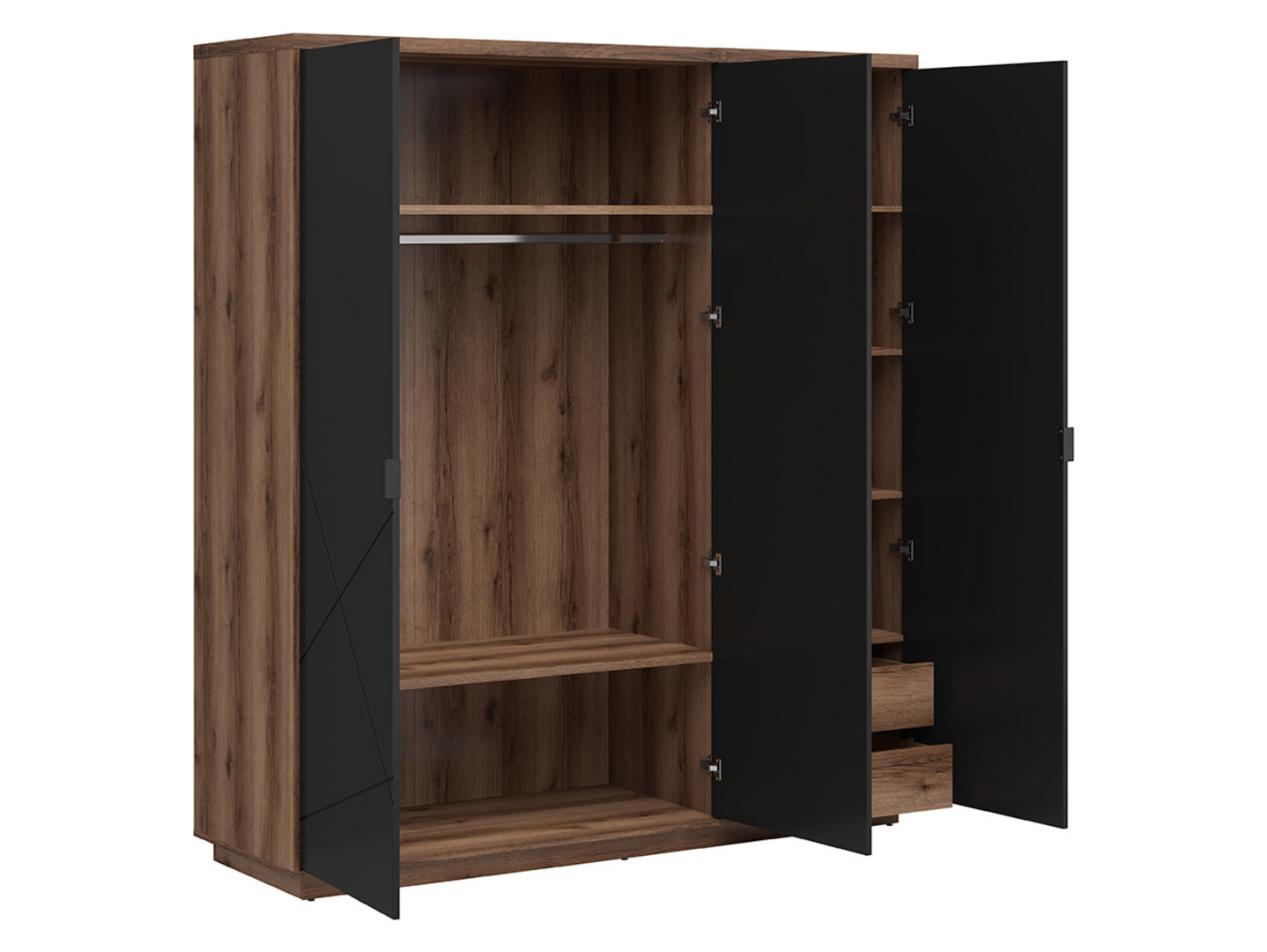 The Forn Wardrobe – An Indispensable Piece of Furniture for a Well-Organized Bedroom. A spacious wardrobe, appropriately matched to the interior design, is a key element of a well-appointed bedroom and wardrobe. Our selection includes the unique Forn wardrobe, which will allow you to organize your everyday clothes and accessories in an incredibly convenient way. Its modern design will allow you to create a stylish, modern interior you’ll love. The Forn wardrobe is made of the highest quality materials, ensuring its durability and functionality. The three-door wardrobe is divided into two sections. The first section contains hanging rails and two spacious, wide shelves. The second section offers ample storage space, including four deep shelves and two convenient drawers. This arrangement allows you to store clothes, bedding, and other textiles. All of these elements are equipped with a soft-close function and metal handles. The fronts, made of MDF with a PVC foil, feature stylish milled patterns that give the wardrobe a cohesive look. The modern character of the Forn collection is emphasized by its availability in various color options, including glossy white, dark Delano oak/matte black, dark Delano oak/glossy white, and glossy white/matte black. You’re sure to find an option that suits your preferences. The Forn wardrobe is not only a functional storage unit but also a design element that will bring a modern touch to your bedroom.