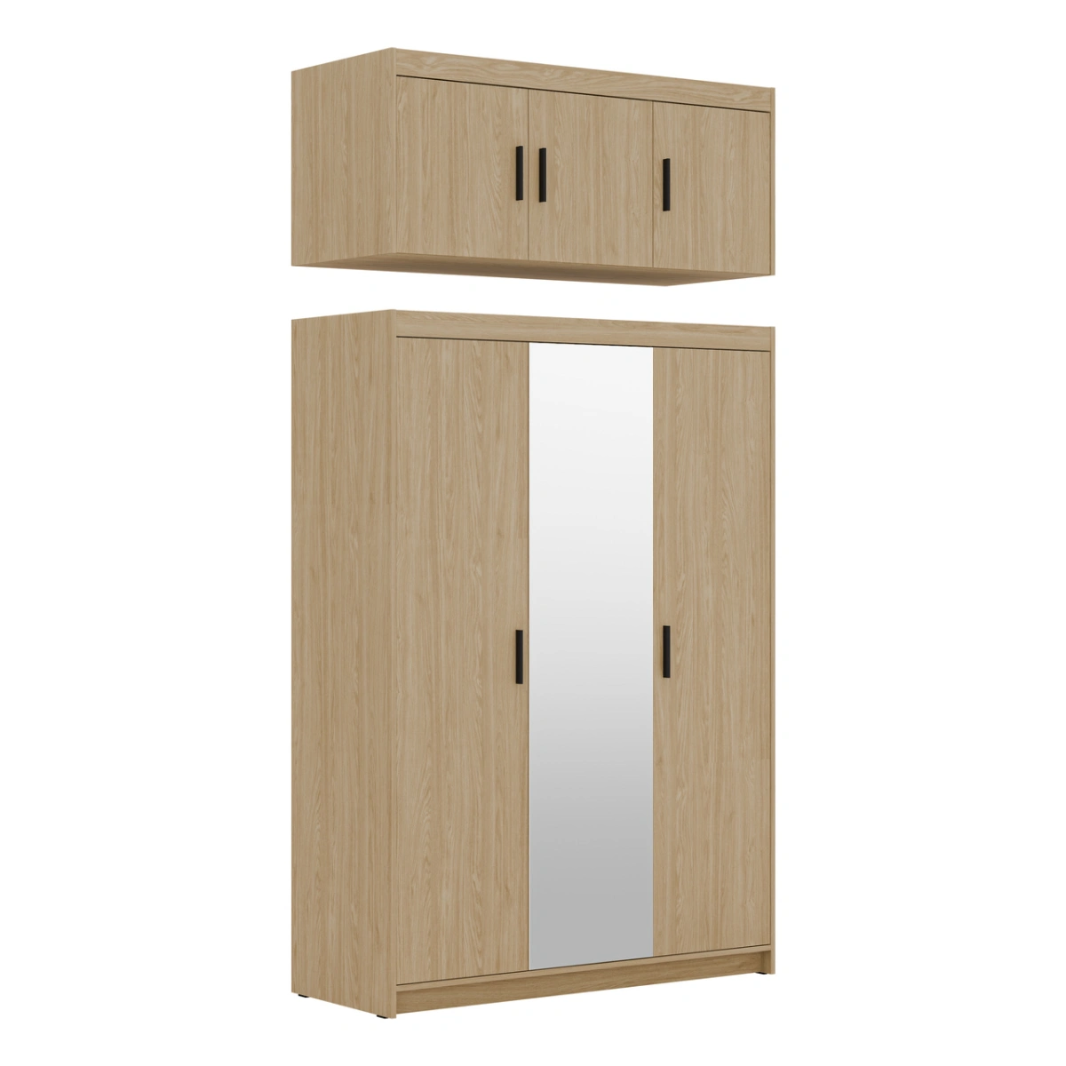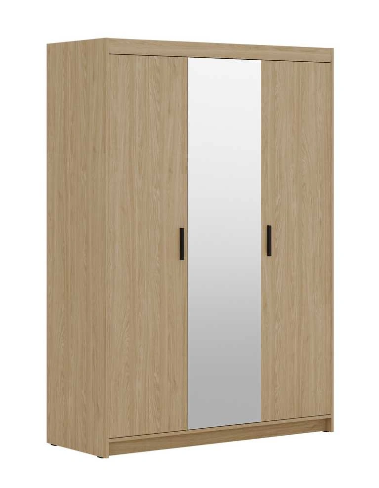 The three-door wardrobe is made of laminated board and features a shelf with a clothes rail underneath, plus four shelves on the central mirrored front.