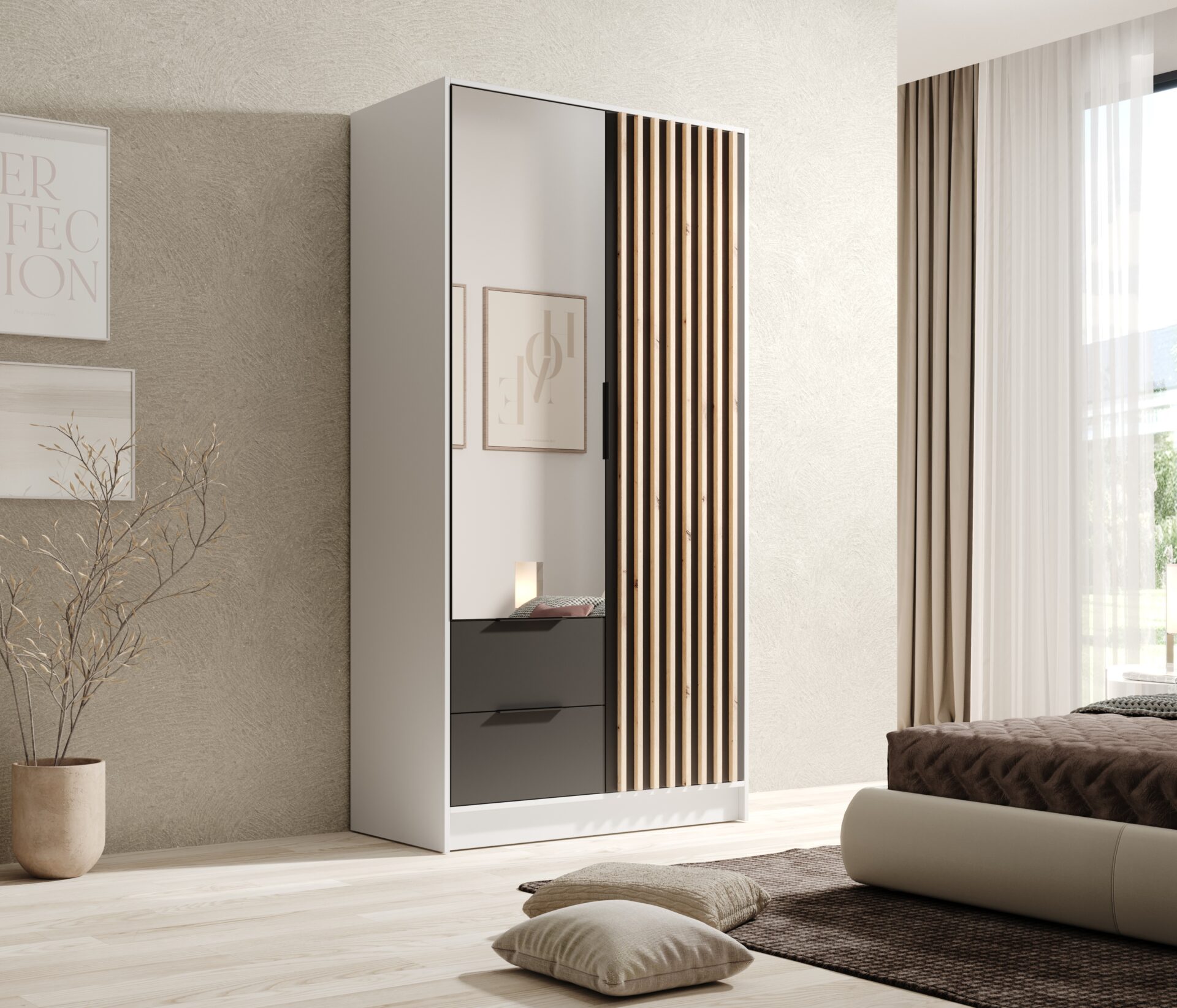 The Neri Hinged Wardrobe is an elegant and functional wardrobe that will perfectly complement both modern and classic interiors. With a wide range of colors, everyone will find a version perfectly suited to their style. The Neri wardrobe features decorative slats on the fronts and a large mirror, which visually enlarges the space and gives it a light feel. The wardrobe is available in three practical sizes: – 100 cm – compact, ideal for smaller rooms; – 150 cm – a perfect compromise between space and size; – 200 cm – a spacious option, ideal for storing a larger wardrobe. Each version is designed with ease of use and aesthetics in mind, enhancing any bedroom or dressing room.