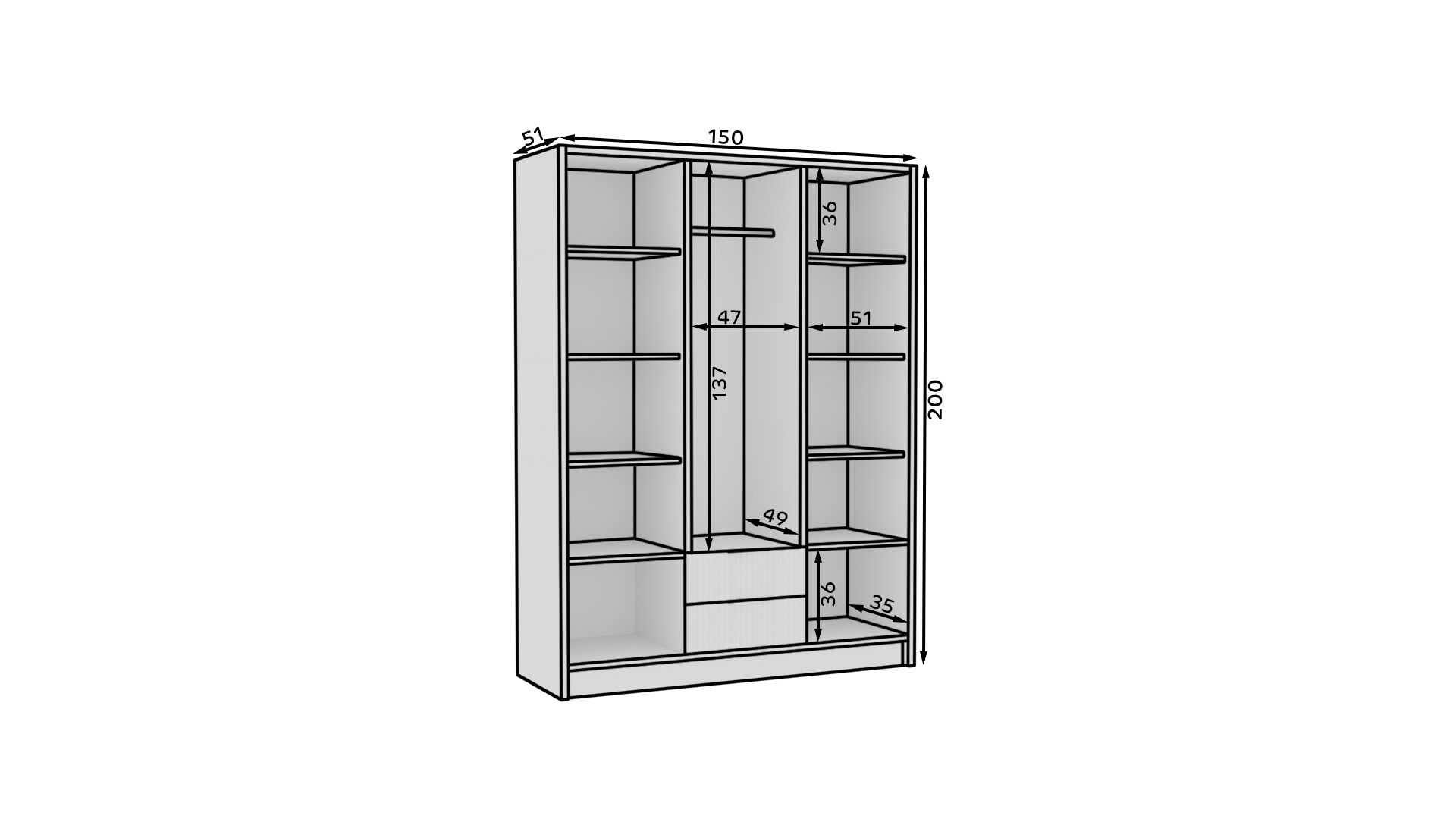 The Norel wardrobe is a piece of furniture characterized by elegance and modern design. Its grooved structure gives it a refined look while adding texture and depth to the room. The focal point is a large mirror, which not only adds space but also serves a practical purpose, allowing you to check your appearance before leaving.